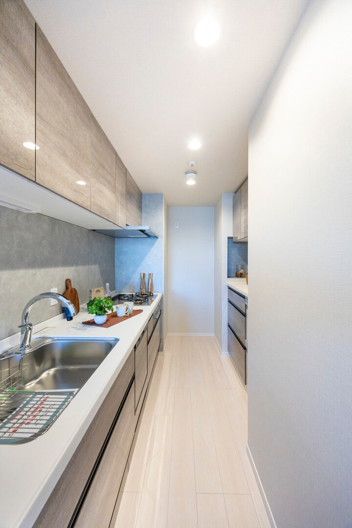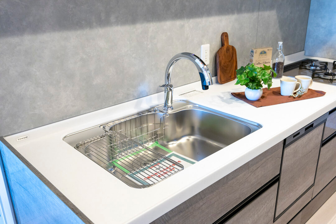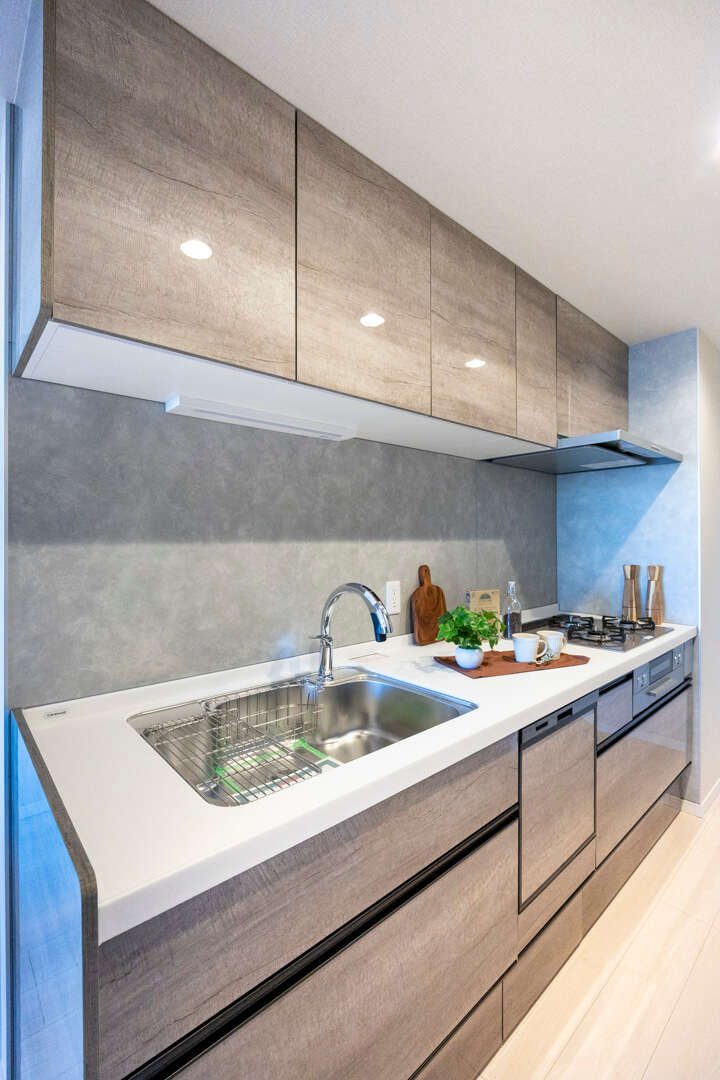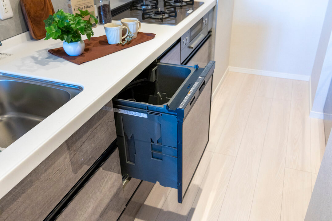 3口コンロ、グリル、食洗機付きと設備面も充実しています。シンクも広々としているので野菜などが洗いやすそうですよ。