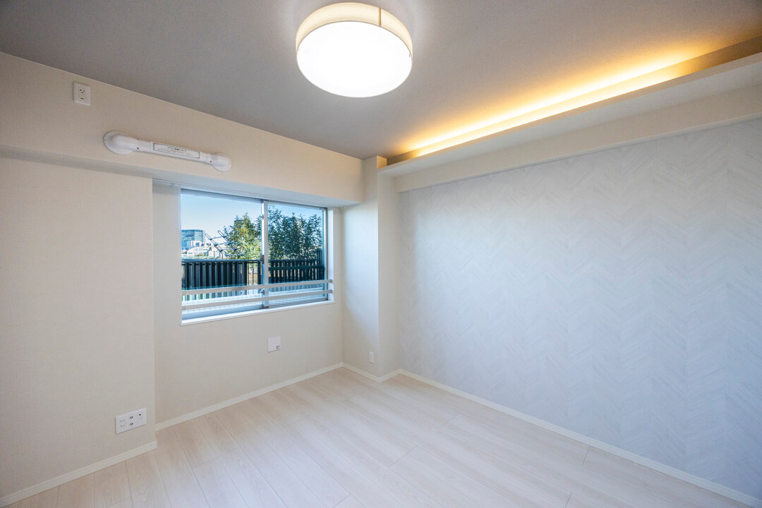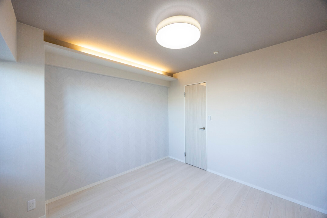 約6.7帖の洋室1は、リビングダイニングに隣接しています。東向きのため、主寝室として使うと目覚めが良さそうですね。アクセントクロス+間接照明でくつろぎの空間が漂い、たくさんの荷物が収納できるマルチウォークインクローゼットが造られています。