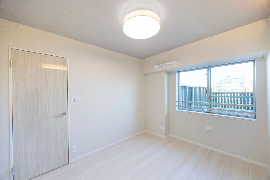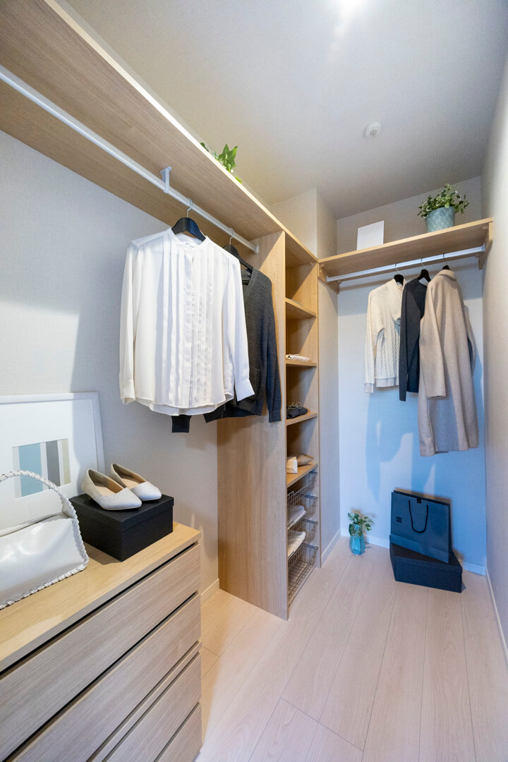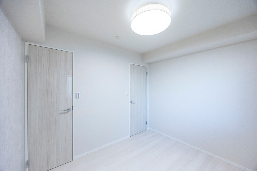 玄関側に位置している約5.6帖の洋室2は、長方形で家具のレイアウトがしやすくなっています。マンション特有の大きな梁も無くて◎。また、可動棚やパイプハンガーが設置されているマルチウォークインクローゼット付きのため、収納スペースがしっかりと確保されています。