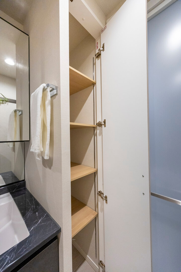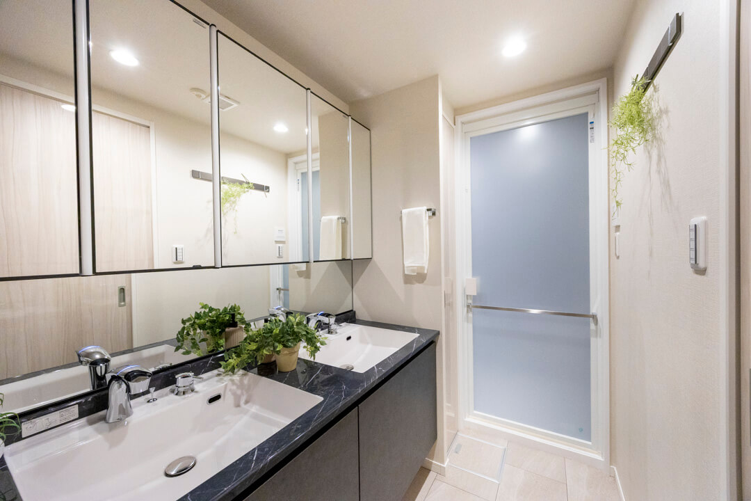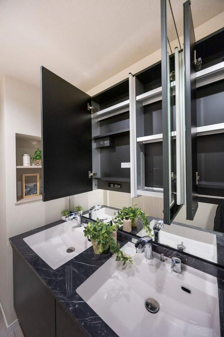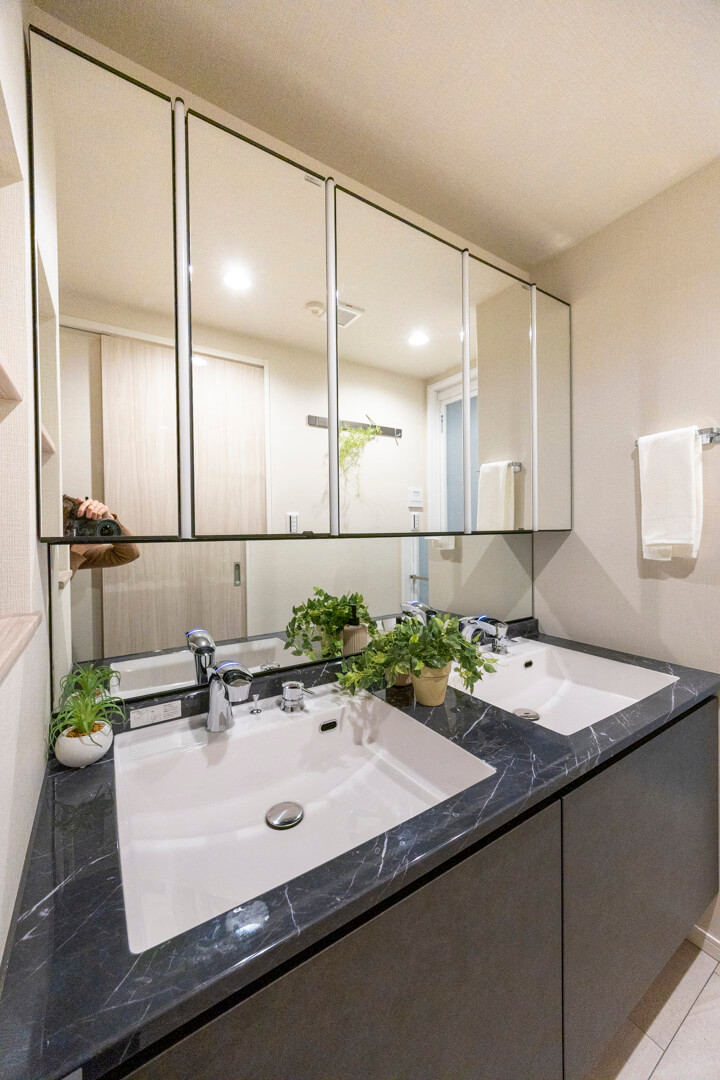 ホテルライクな2ボウル洗面の化粧台です。忙しい朝でも並んで支度ができて便利。ミラーボックスの中には化粧品などが収納できるので使い勝手も良好です。また、照明が縦に配置されており、顔に影をつくらないのも◎。横にはリネン庫があるので、ごちゃごちゃしがちな洗面まわりもきちんと整頓できます。