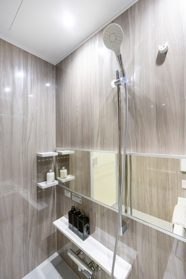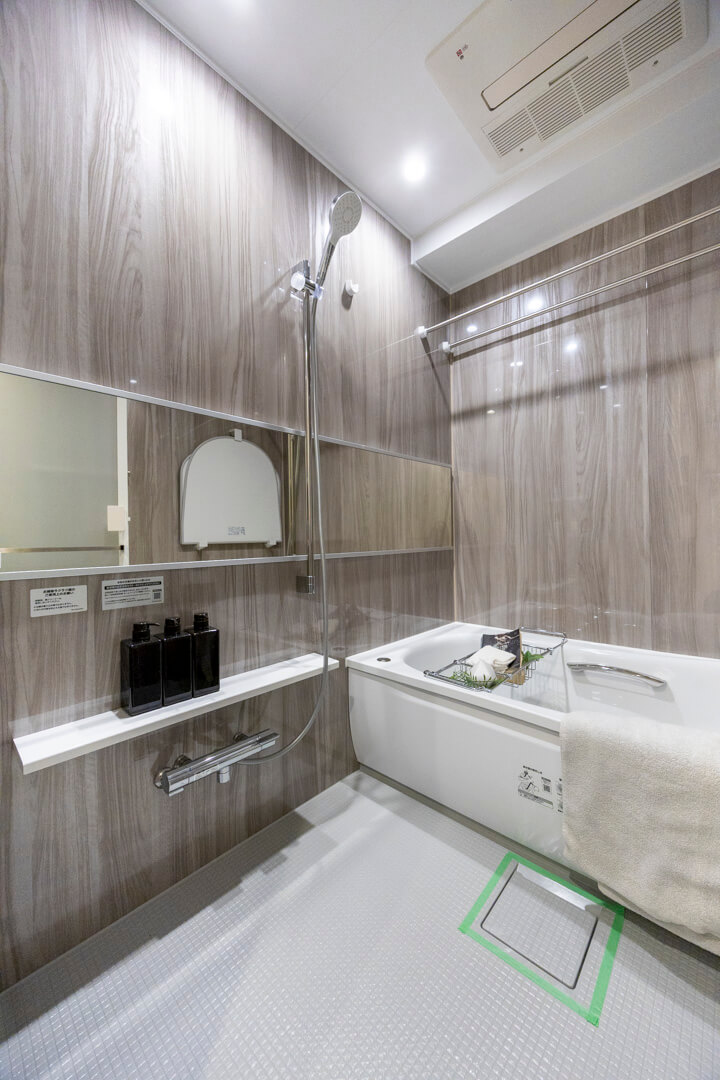 ブラウンの壁パネルが落ち着いた雰囲気を演出してくれている1418サイズの浴室です。お風呂にゆっくり浸かるのが好きという方に嬉しい追い焚き機能を搭載。家族の入浴時間がずれてしまっても安心です。浴室乾燥機には暖房・乾燥・換気・涼風の機能がついており、一年中快適に過ごすことができます。また、浴槽はベンチ浴槽になっているので、半身浴などもしやすそうです。