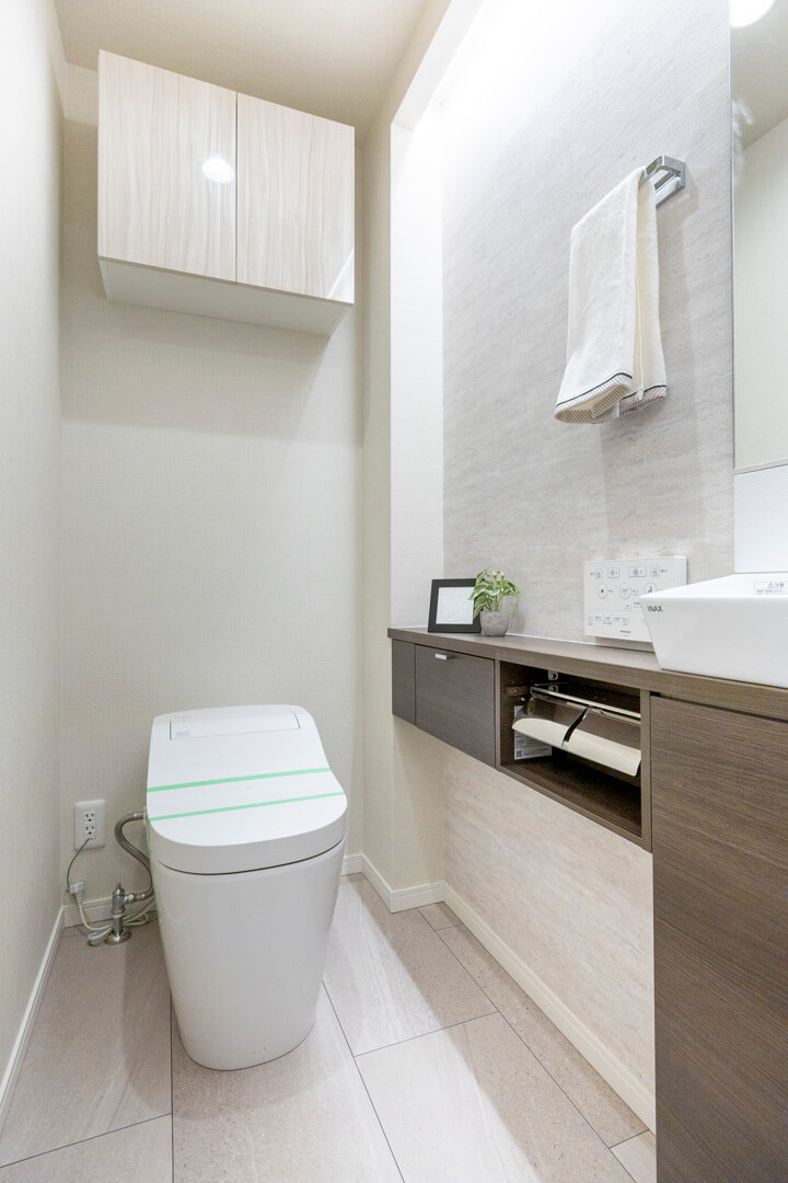 ウォシュレット一体型のトイレです。タンクレスタイプなのですっきりとした印象に。また、別途で手洗い器と鏡が造られているので、その場でサッと身だしなみを整えることができます。上部には吊戸棚が設置されていて、収納スペースもありますよ。