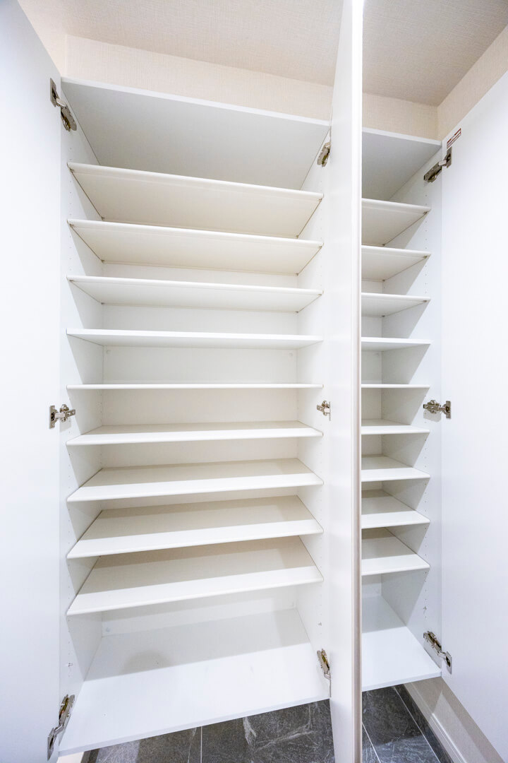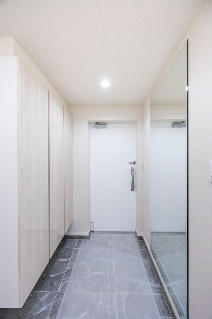 高級感を醸し出している玄関には、シューズボックスが備え付けられています。高さがありますが、フロートタイプのため空間に圧迫感を与えません。反対側の壁面には大きな鏡が設置されており、出かける際に全身のコーディネートをチェックすることができます。