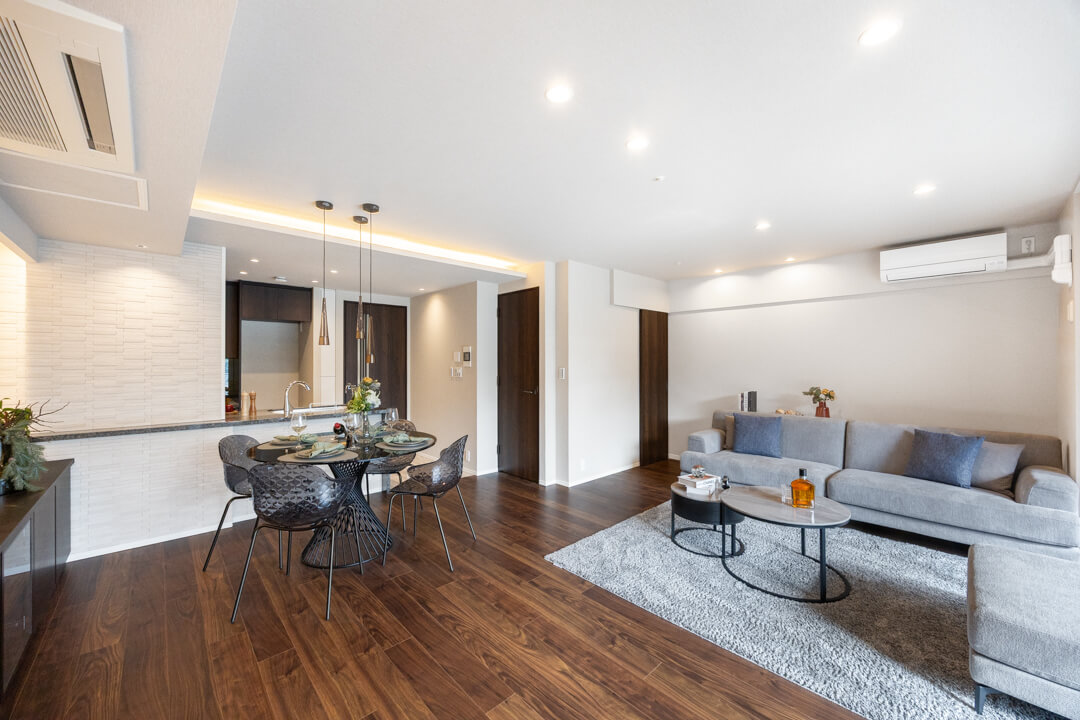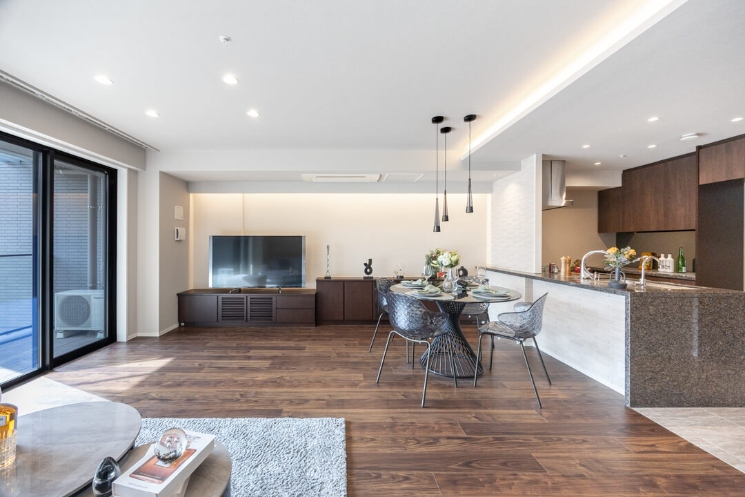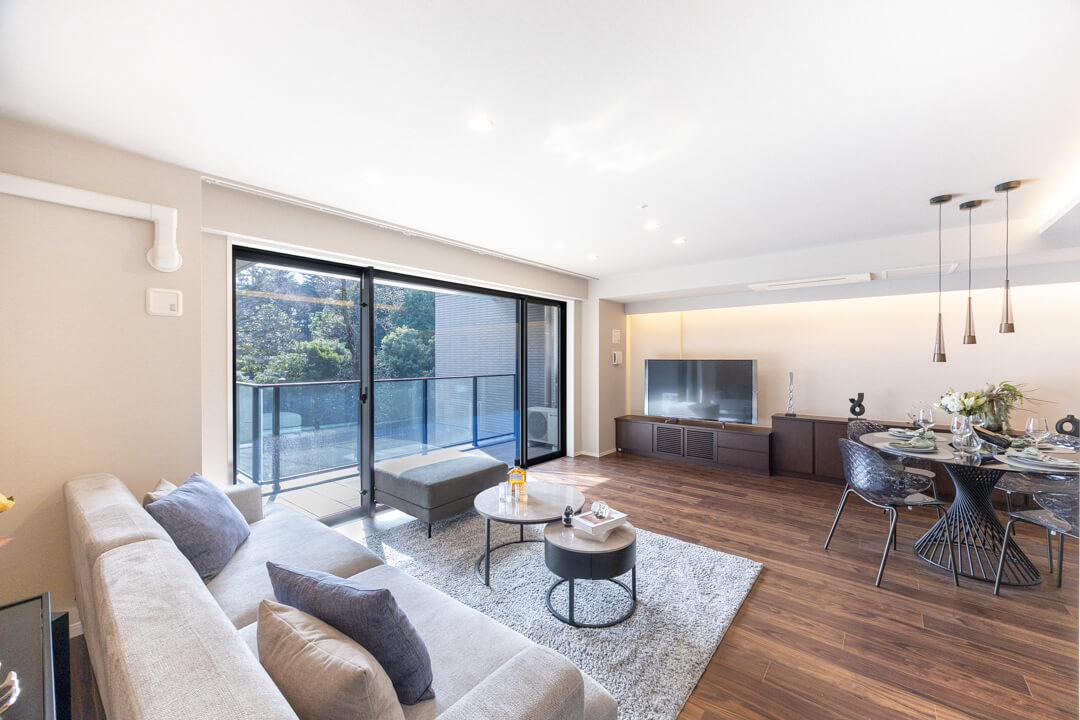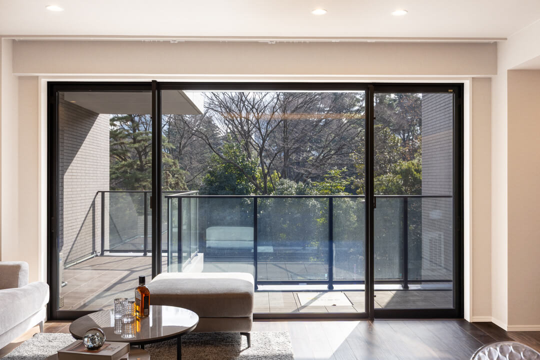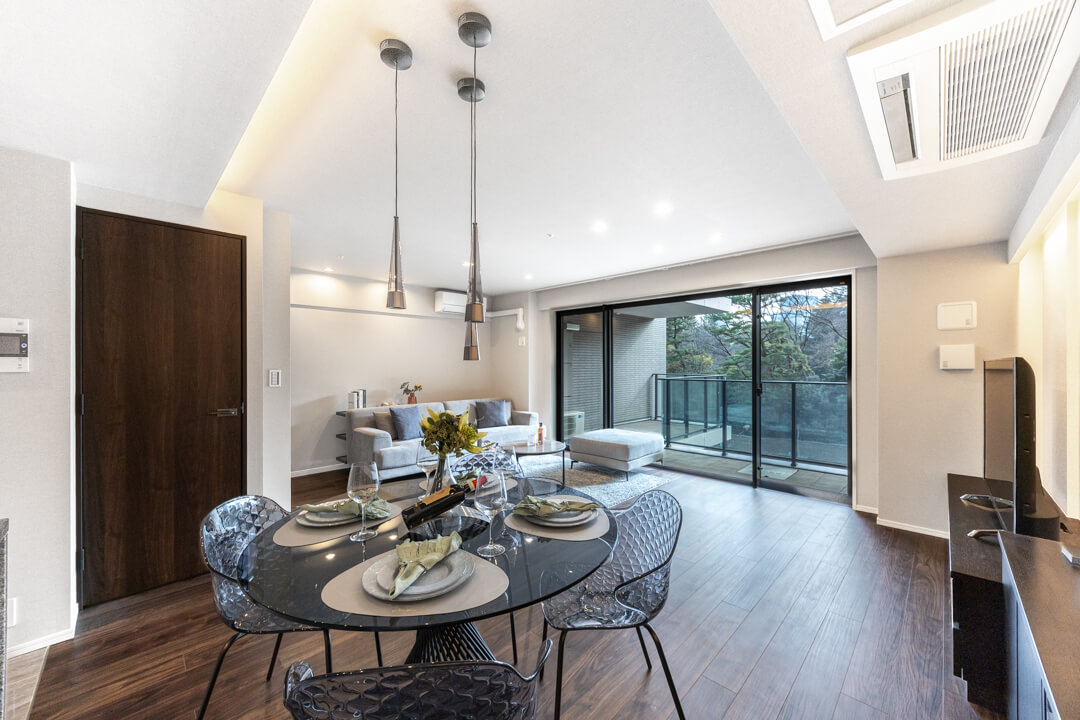 キッチンスペースを含め、約22.1帖のLDK。家族でゆったり過ごせる広さです。空間の印象を決める大きな窓で開放感たっぷり。テラスバルコニーへ出入りできます。バルコニー手すりが透明で室内からでも眺望良好。赤坂御用地の緑が望める贅沢な景色です。