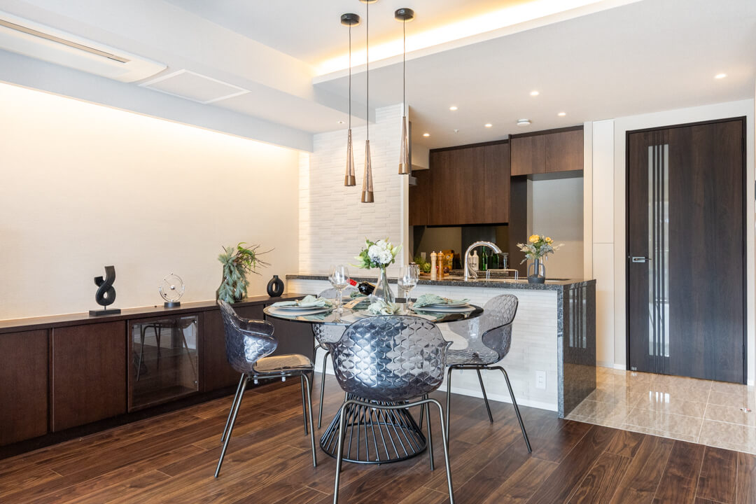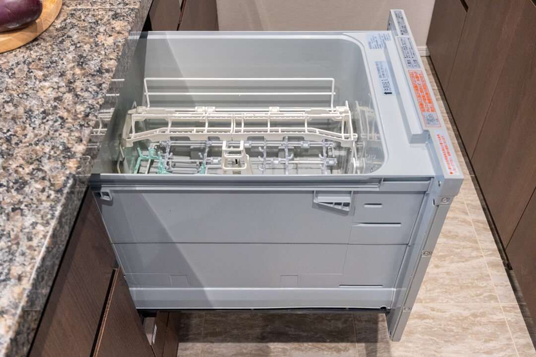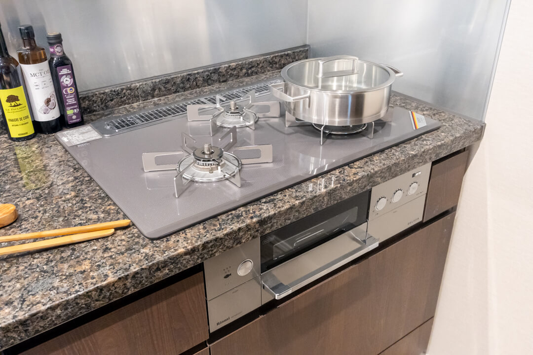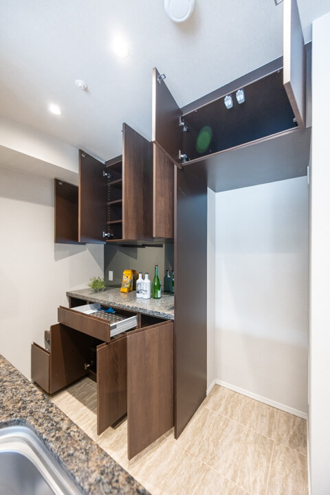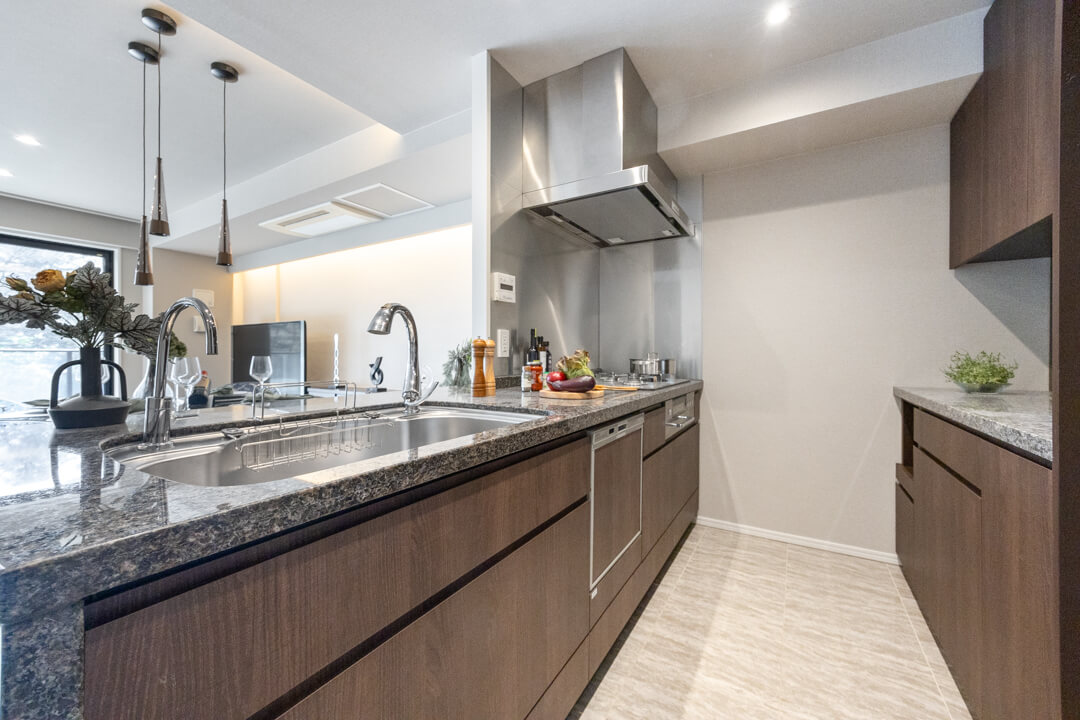 対面型のシステムキッチン。家族やゲストと会話がしやすく、小さなお子さんがいるご家庭では子どもの姿も見守れます。料理が捗る3口ガスコンロ、家事の時短に心強い食洗機、生ゴミの処理に便利なディスポーザー付きで設備も充実しています。カップボード、パントリー付きで収納スペースもしっかり確保されています。
