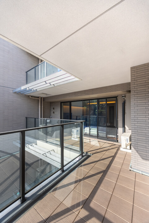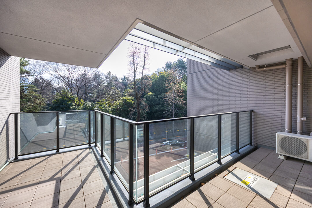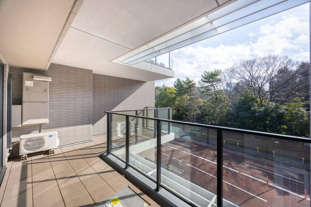 リビングダイニングに面したテラスバルコニー。約17.68㎡ほどゆとりある広さです。バルコニー手すりが透明で、景色を遮らず開放的。蛇口が付いているので植物の水やりなどに便利です。バルコニーからは赤坂御用地(迎賓館)の緑が望め、自然を身近に感じられます。