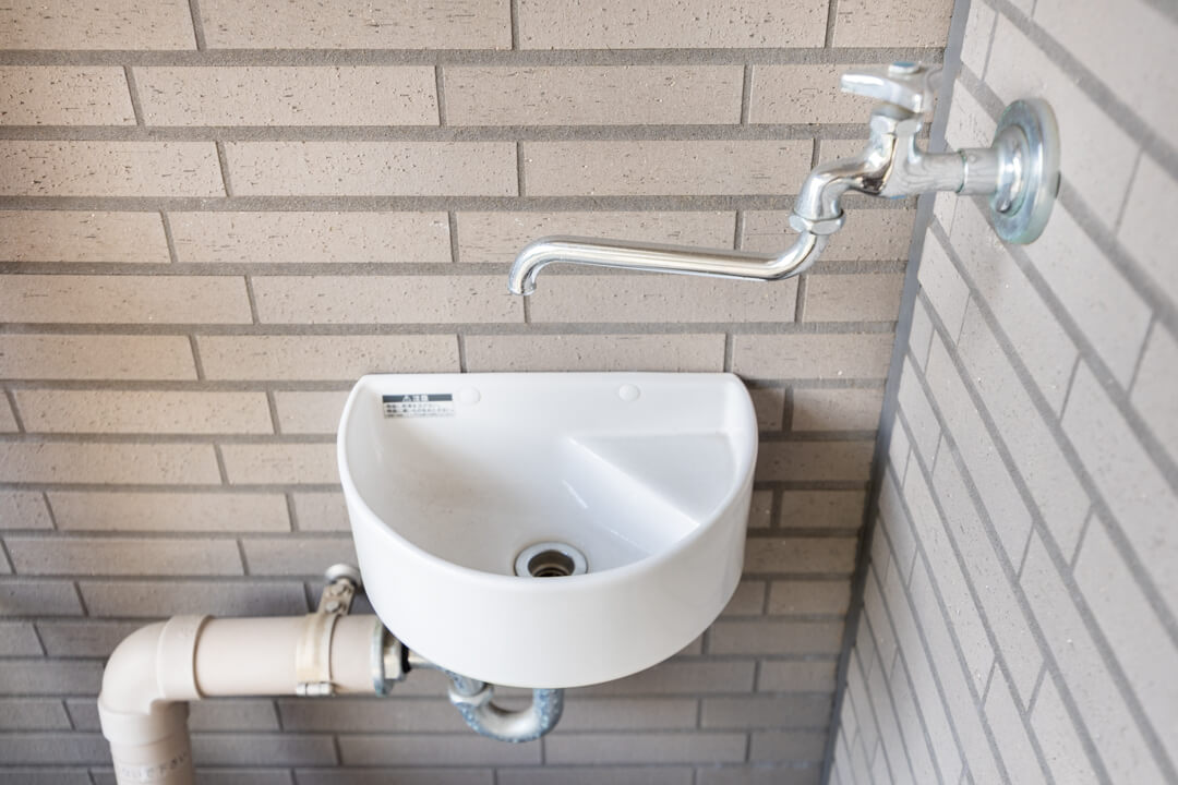 廊下に面したレストルーム。空間がすっきり見えるタンクレストイレです。手洗いカウンター、収納スペース、ウォシュレットも備わっています。