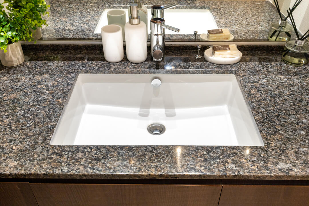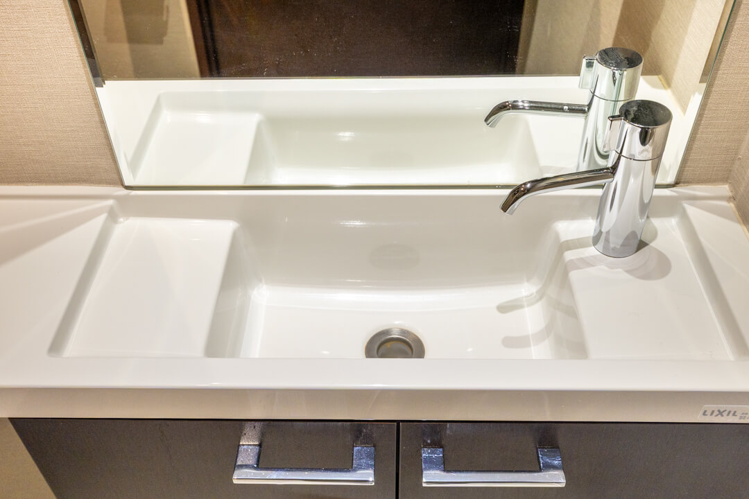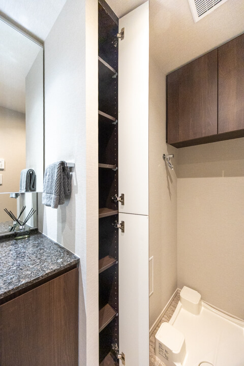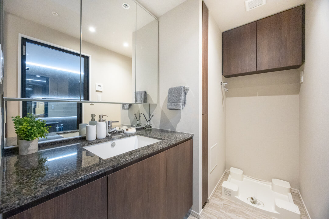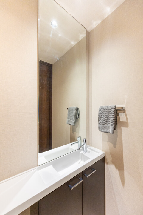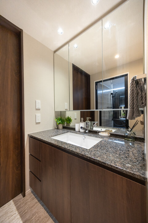 重厚感のある雰囲気の洗面化粧台。洗面まわりの小物がすっきり整頓できるミラーボックス付きで、いつでも整った状態をキープできそうです。洗面台とは別途、リネン庫も備わっています。