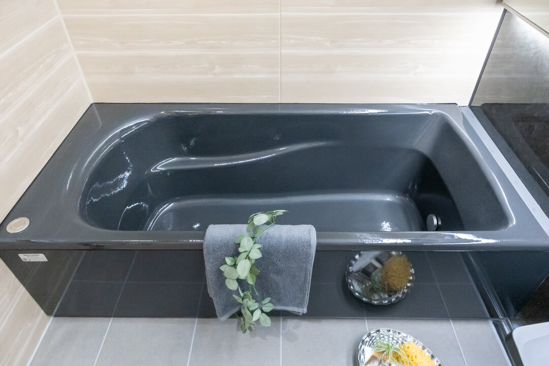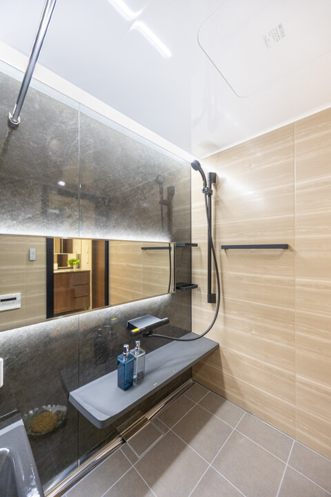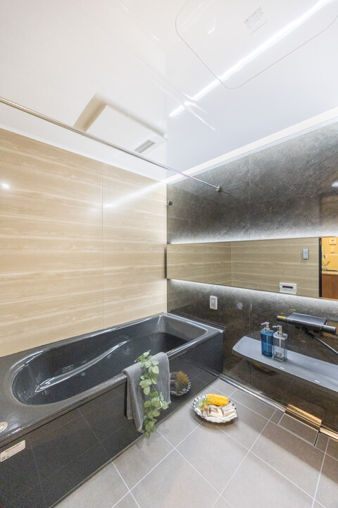 2種類のアクセントパネルが施されたバスルーム。浴室照明は明るさと色味の調整ができ、気分によって使分けができます。追い炊き機能の他、乾燥・換気・暖房・涼風の4つの機能が備わっていて、一年中快適にバスタイムが楽しめます。ランドリーパイプも付いていて、雨の日や冬場の洗濯にも困りません。