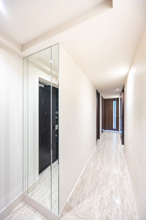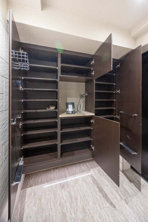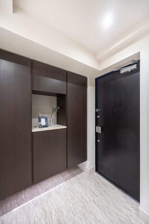 玄関には大容量のシューズボックスを完備。中央部分がカウンターになっていて、季節の花やアートを飾って玄関に彩りをプラスできます。