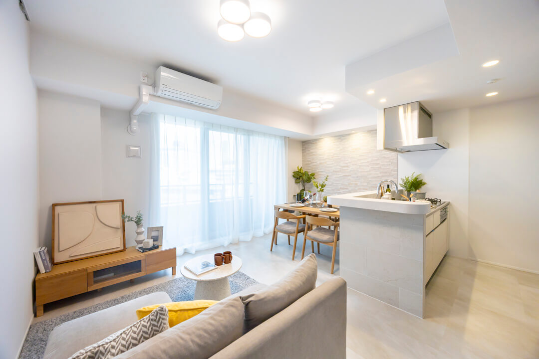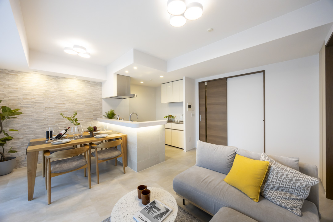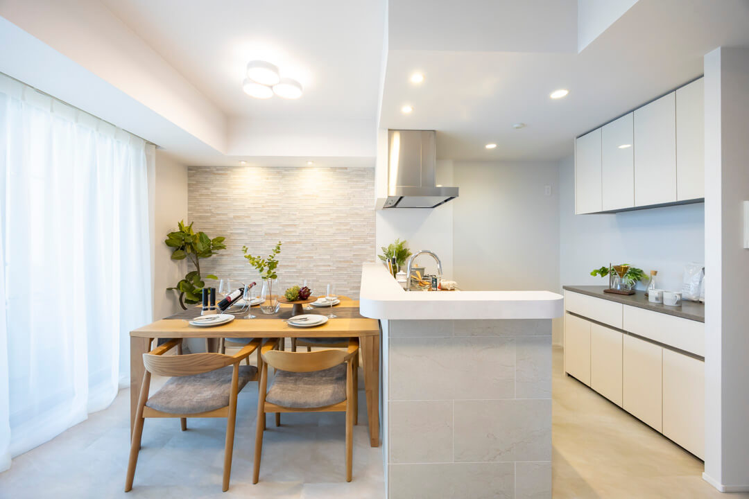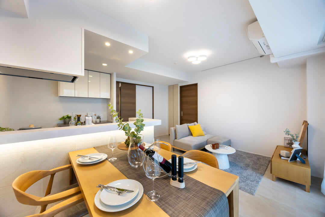 約10.8帖のリビングダイニング。バルコニーに面した大きな窓からやわらかな自然光が差し込み、心安らぐひとときを演出します。明るく清潔感のある内装に、タイル調のエコカラットでアクセントを。空間全体に上質な表情を添えています。エコカラットには調湿・脱臭機能も備わっていて、湿気が気になる梅雨時期も快適。ペットのにおい対策としても効果が期待できます。