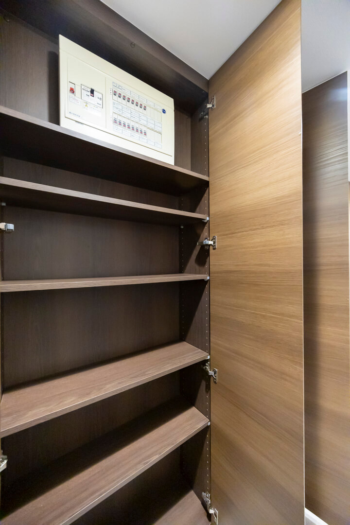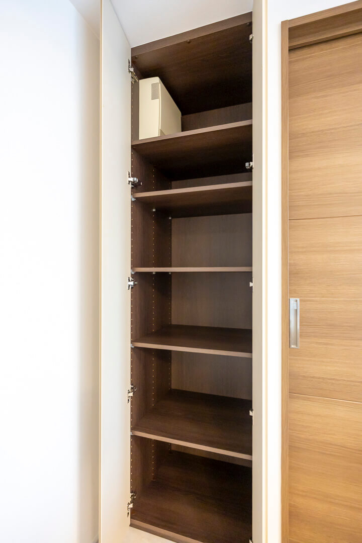 生活小物や書類の収納に便利な可動棚収納を完備しています。扉を閉めれば生活感をしっかり目隠しできますよ。すっきりとしたリビング空間を実現できそうですね。