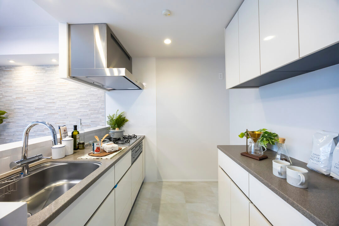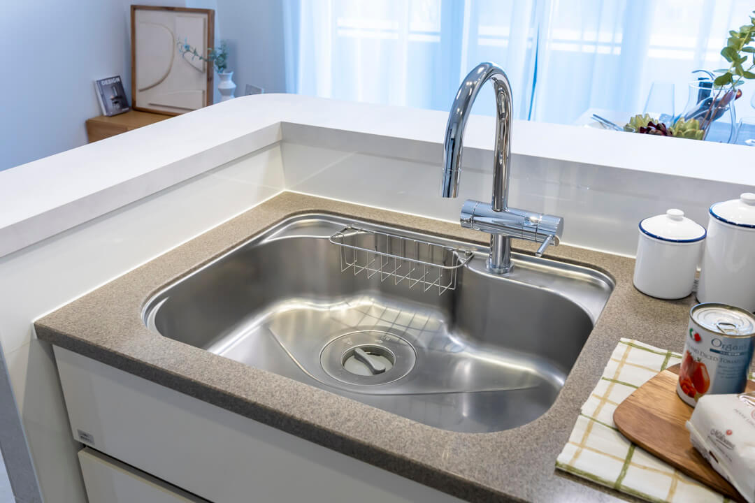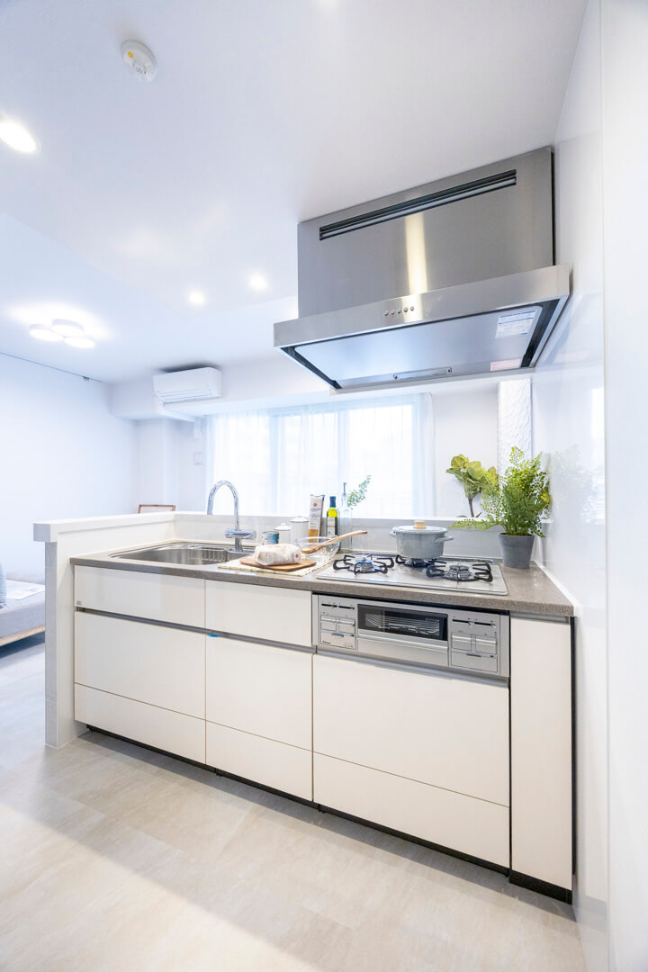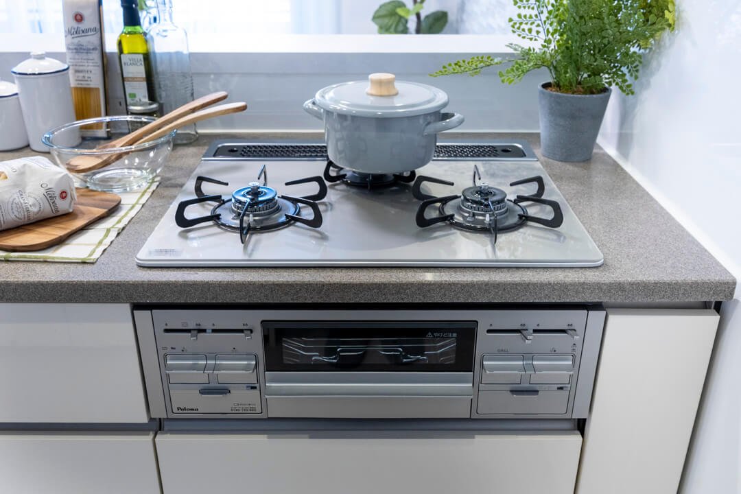 同時調理が叶うグリル付3口ガスコンロを内蔵。さらに、シンクにはディスポーザーが搭載されています。料理後すぐに生ゴミを処理できるので、悪臭の原因を防ぐことができます。生ゴミを溜めることがないので、虫が発生する可能性が減るのも嬉しいポイントです。