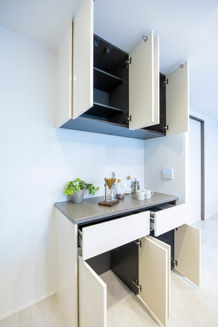 背面には収納力のあるカップボードを完備。キッチンと同じデザインで統一感があります。食料品のストックや食器類を整理整頓でき、いつも清潔なキッチンをキープできそうです。