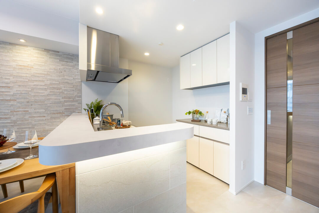 約2.9帖のキッチンスペース。間接照明を配したカウンターが、空間にやわらかな表情を添えています。開放的な対面タイプながら、立ち上がり壁が手元をさりげなくカバー。生活感を抑えつつ、来客時も落ち着いて調理に向き合える設計です。