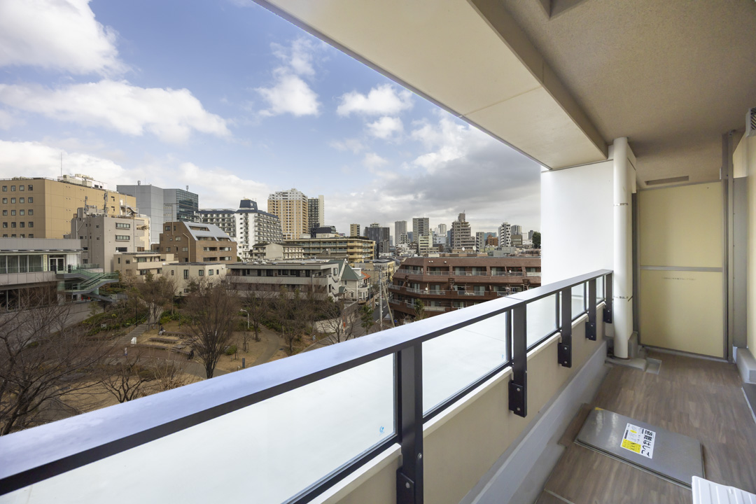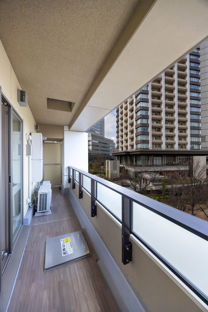LDKと寝室に跨るワイドスパンバルコニー。9.37㎡の広々としたスぺースです。「目黒セントラルスクエア森の広場」に面していて抜けのある眺め。都心でありながら穏やかな景色が魅力です。