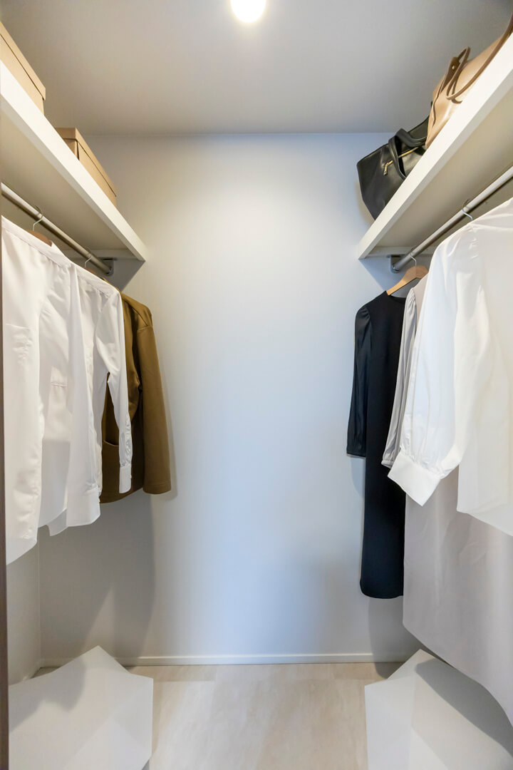 約6.1帖の寝室。北東向きの窓からやわらかな自然光が届く空間です。シングルベッドを2台置いてもゆとりがあるスぺースで、ゆったりお休みいただけます。WIC(ウォークインクローゼット)完備で収納力も◎。衣類はもちろん、トランクケースやゴルフバッグといった大きな荷物も収納でき、居室空間を有効活用できます。
