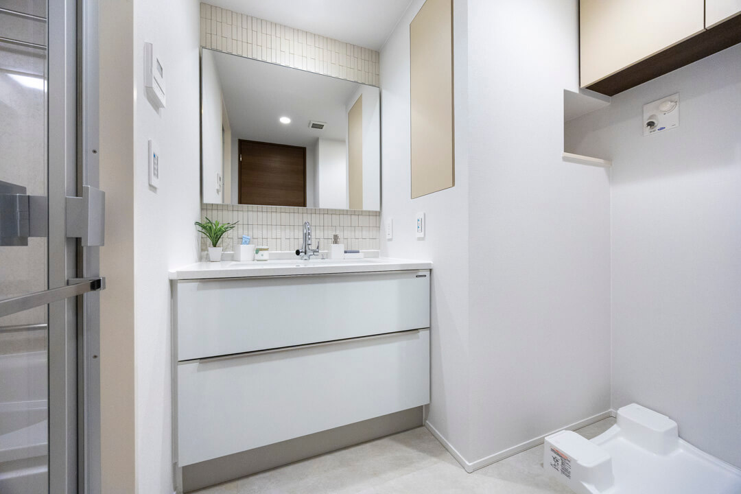 白基調で清潔感のある洗面化粧台。タイル調のアクセントウォールが洗練された雰囲気を演出します。大開口の洗面ボウルで使い勝手良好◎。足元の引き出しに加え、壁面収納も完備していて、散らかりがちな洗面まわりがすっきり片付きます。