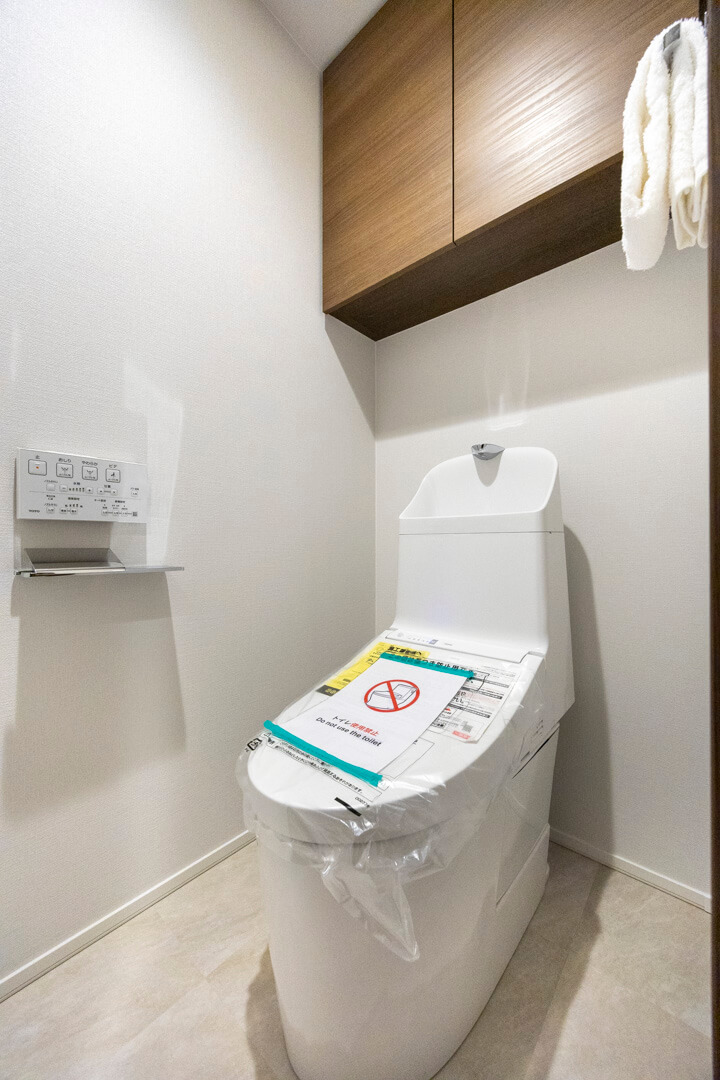 廊下に面していて独立性の高いレストルーム。TOTO製の洗浄機能付トイレに交換済みです。水栓部分とペーパーホルダーがシルバーで統一されていて、スタイリッシュ。トイレットペーパーや掃除用品は吊戸棚に収納でき、生活感が出る部分を目隠しできます。