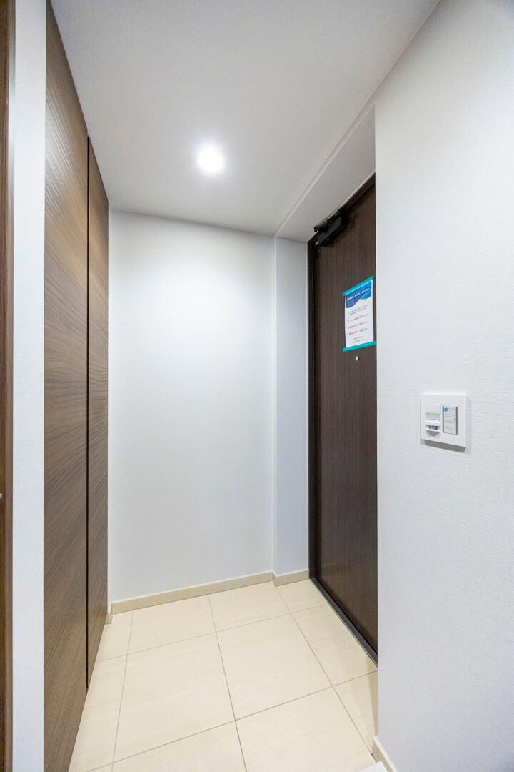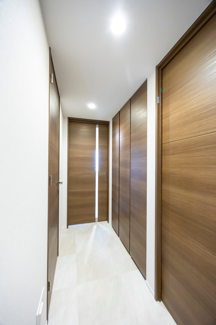 人感センサー搭載でいつも明るく出迎えてくれる玄関。玄関には人感センサー付照明が設置されていて、夜遅く帰宅しても明るく出迎えてくれます。正面にはシューズボックスがあり、靴はもちろん、雨具もすっきり収納可能◎。廊下にも物入があり、日用品ストックやペットグッズの収納に重宝しそうです。