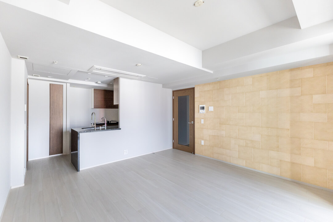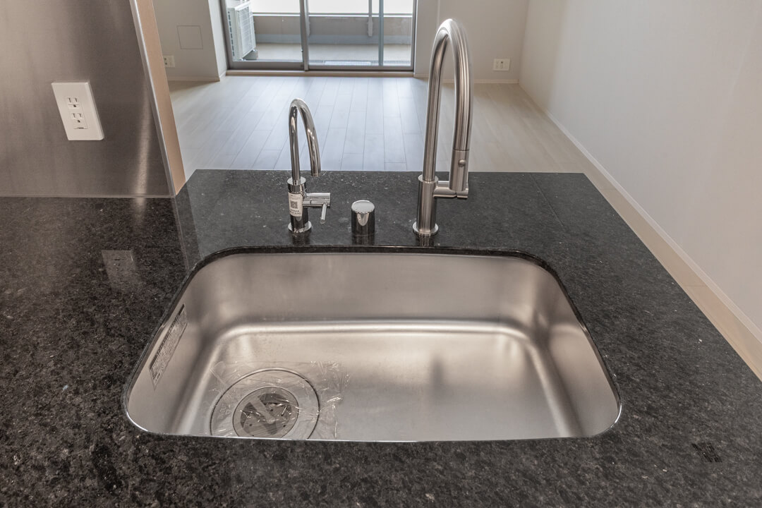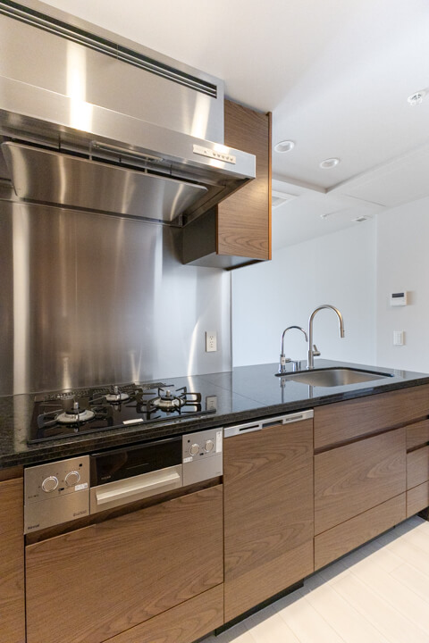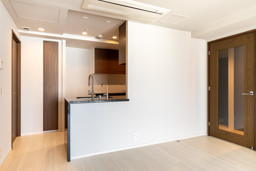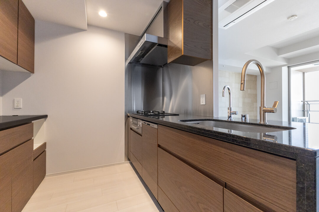約3.2帖のキッチンスペース。木目扉&石調カウンターが高級感を演出します。シンク側からはリビングダイニングを見渡すことができ、開放的な気分で調理が可能。パートナーやゲストとの会話を楽しめるのもポイントです。