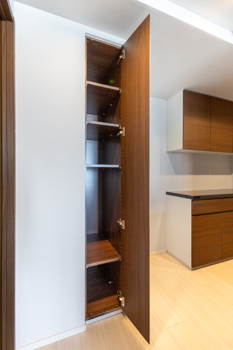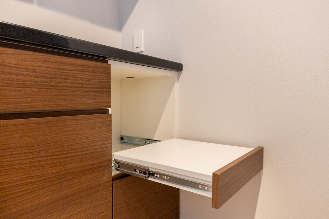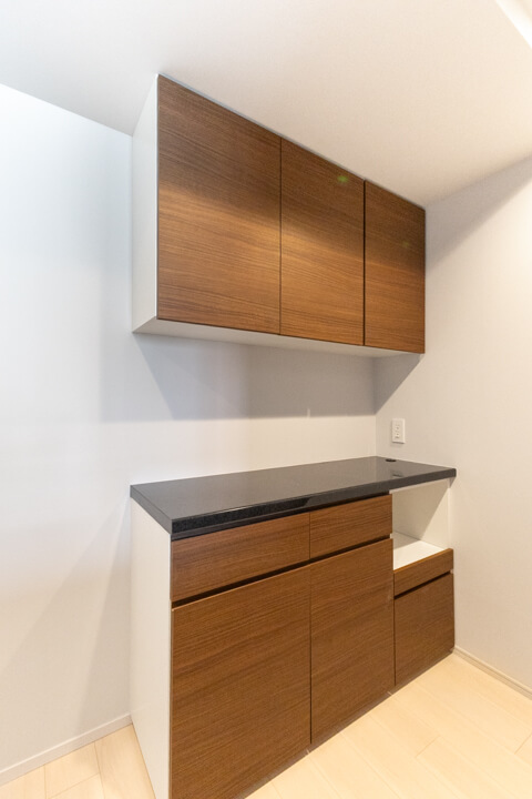 背面には収納力のあるカップボードを完備しています。食料品のストックや食器類を整理整頓でき、いつも清潔なキッチン空間をキープできそうですね。カウンターにはコンセントが付いていて、トレイボードはコードを繋げることが可能。キッチン家電の使用に便利です。
