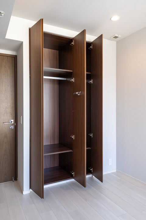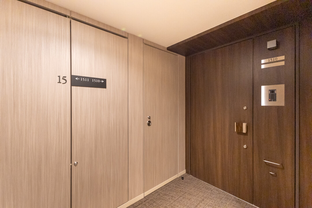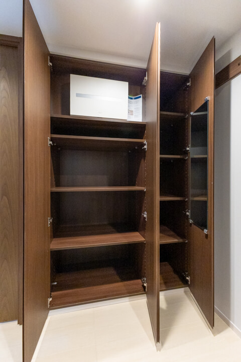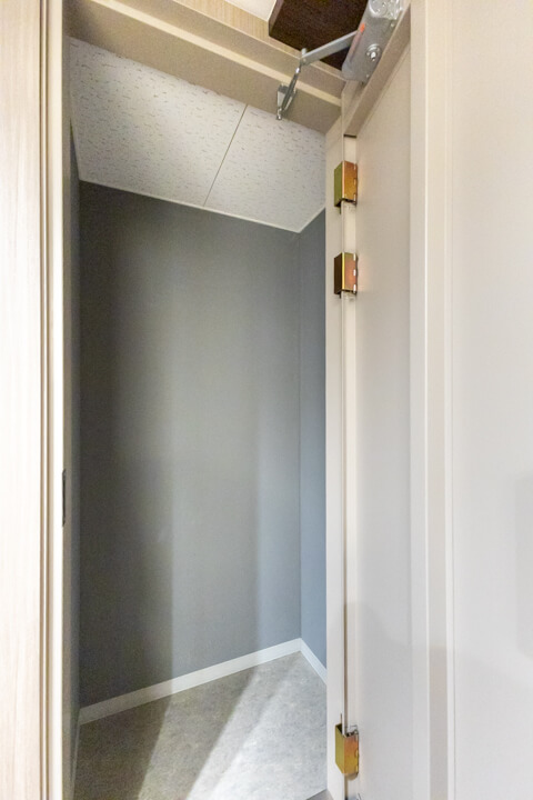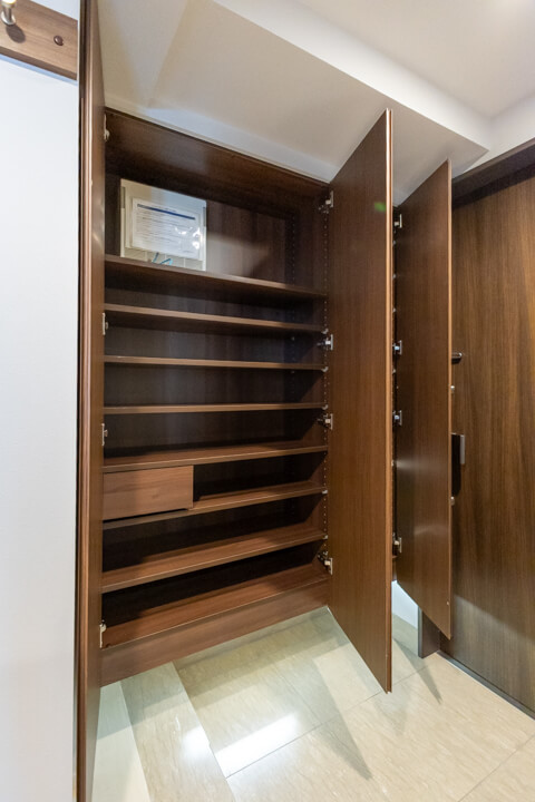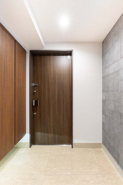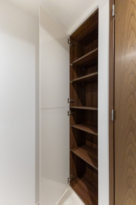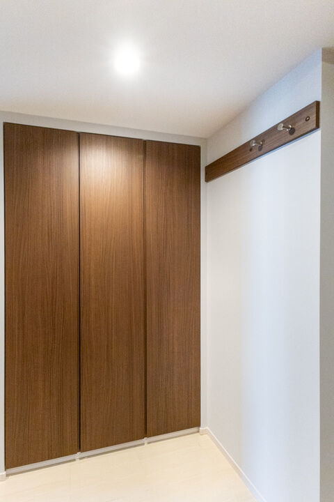 石調のアクセントウォールがホテルライクな空間を演出。人感センサー搭載で、いつも明るく出迎えてくれる玄関です。大容量のシューズボックスを備え、散らかりがちな靴をすっきり収納可能。廊下にも物入があり、日用品ストックやペットグッズの収納に便利です。さらに、コートフックが設置されているので、帰宅後すぐにコートや上着を掛けることができ、室内に花粉や外気の汚れを持ち込みにくいのも嬉しいポイントです。