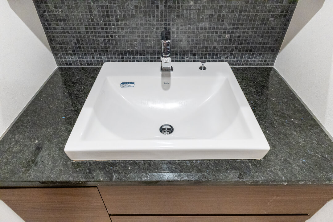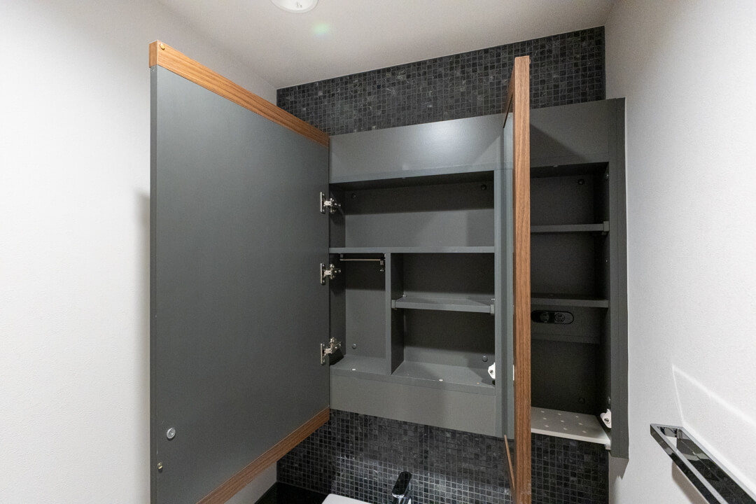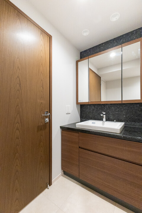 重厚感の漂うデザインが印象的な洗面化粧台。大きな三面鏡付きで身だしなみを整えるのに便利です。カウンタースペースにゆとりがあり、化粧品やドライヤーの仮置きができるのも嬉しいポイント。ミラーボックス・足元の引き出しに加え、リネン庫も備わっていて収納性に優れた空間です。