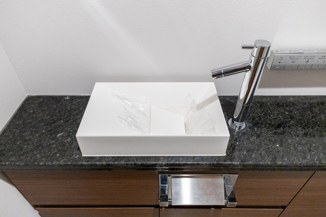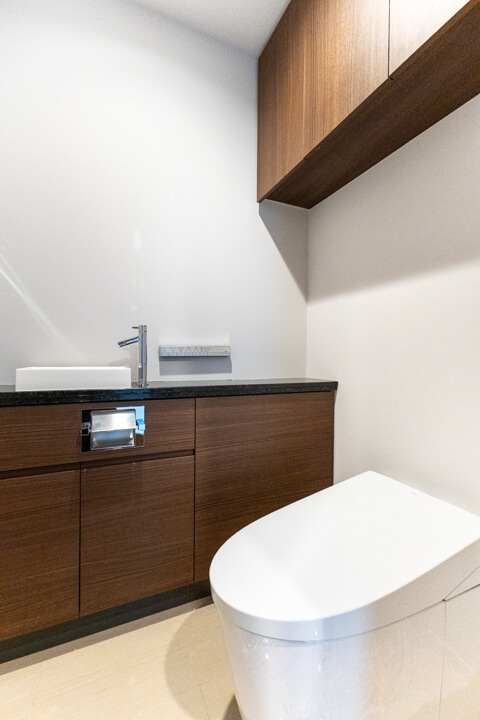 廊下に面していて独立性の高いレストルーム。TOTO製の洗浄機能付トイレに交換済みです。タンクレス仕様でスタイリッシュ。便フタは自動開閉式なので、かがむ必要がなく、腰への負担が減るのも嬉しいポイントです。手洗いカウンター付きですぐに手を洗うことができ、ゲストを洗面室まで案内する手間もかかりません。