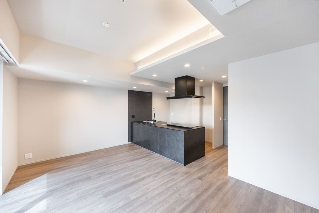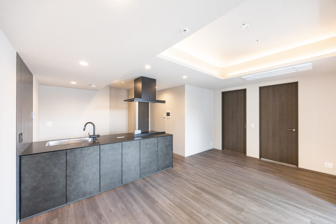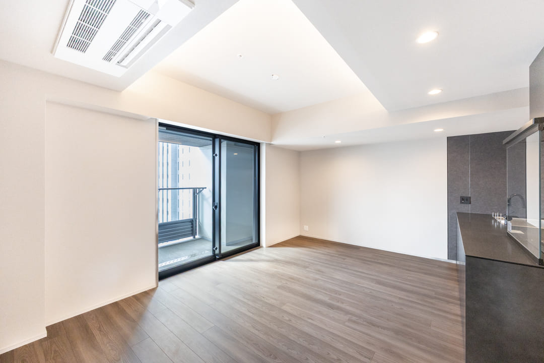約12.0帖のリビングダイニングは、南西向きのため日当たりが良好です。天井には間接照明があしらわれていて、お部屋を上品な雰囲気に演出してくれます。また、エアコンは埋め込み式のためインテリアの邪魔にならないのも◎。