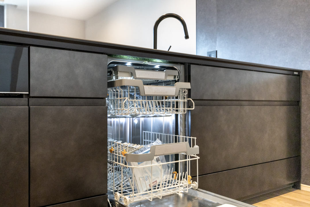 3口IHクッキングヒーター、コンロ、グリル、ディスポーザー、食洗機付きと設備面も充実しています。食洗機は、ドイツの高級家電ブランドMiele(ミーレ)製の大型食洗機です。大きなサイズ感でパーティーや来客時での後片付けの負担を大幅に軽減してくれます。また、静音設計でマンションでも嬉しく、省エネ性能にも優れていますよ。