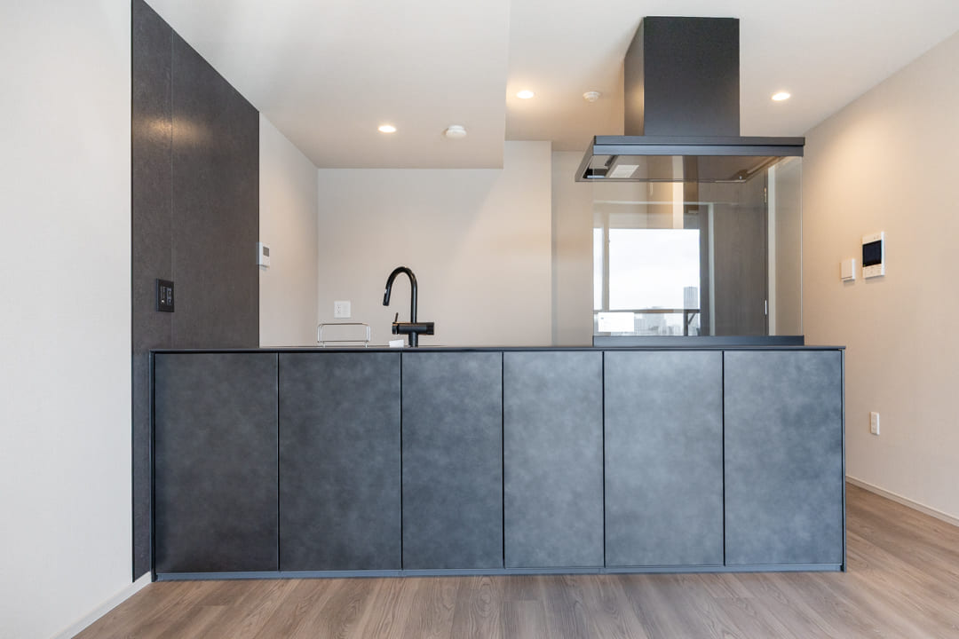 シックな印象のLIXIL製キッチンは最上位モデルを採用、リビングダイニングを見渡しながら料理ができる対面式です。家族や来客とのコミュニケーションが取りやすくて◎。