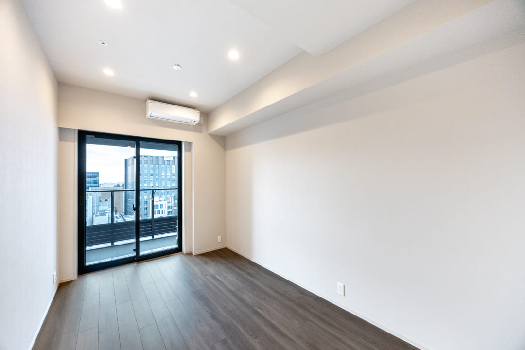 約7.8帖の寝室1は、ゆとりがあって主寝室に良さそうなお部屋です。大きめのベッドも配置できそうですよ。窓からはバルコニーにアクセスが可能。また、奥行きがあるウォークインクローゼットのため、洋服や大きめの荷物も収納することができます。