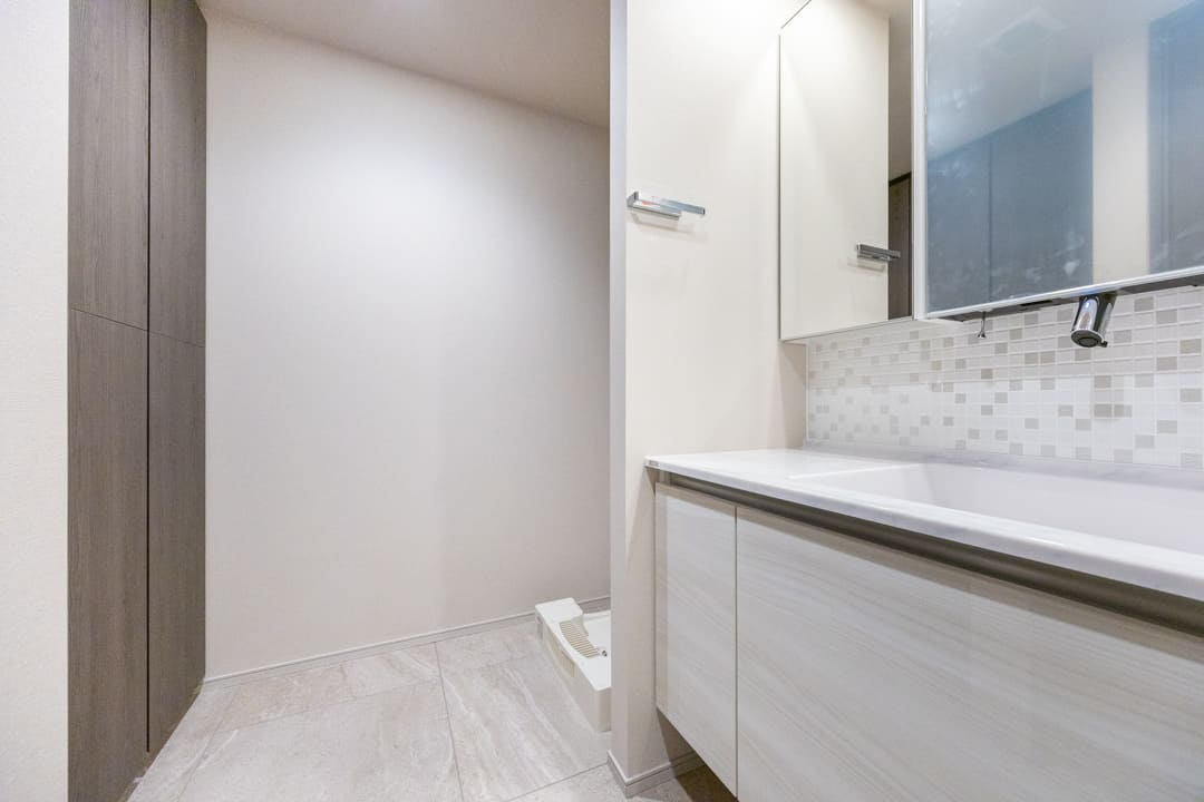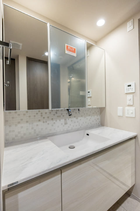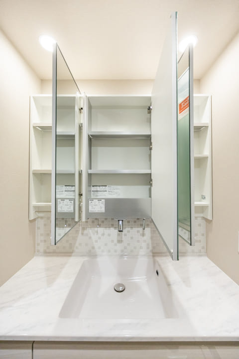 タイルがアクセントになっているLIXIL製の洗面化粧台。三面鏡の中には化粧品などが収納できて使い勝手が良好です。照明が縦に配置されていて、顔に影をつくらないのも◎。水栓が下向きに設置されており、水が溜まりにくくなっているのでお手入れも簡単です。また、背面側にはリネン庫が造られており、ごちゃごちゃしがちな洗面まわりもきちんと整頓することができます。
