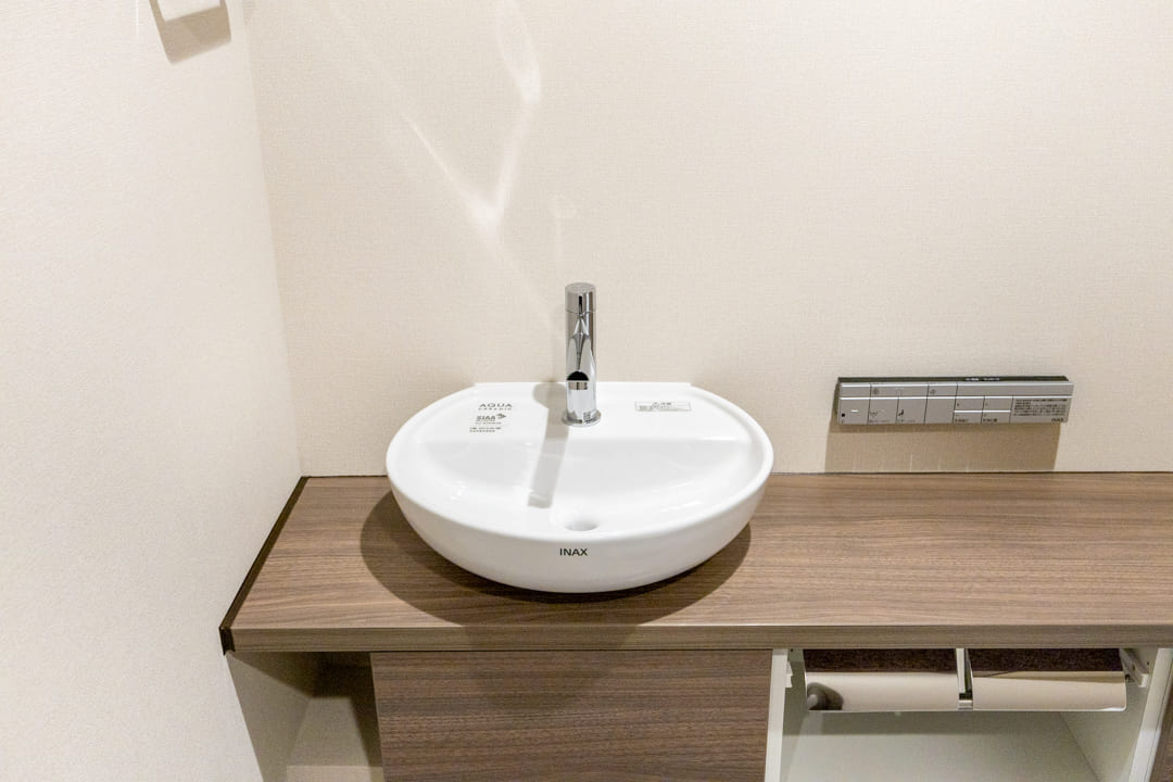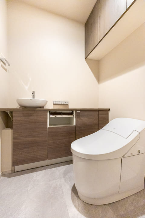 ウォシュレット一体型のトイレです。タンクレスタイプなのですっきりとした印象に。また、別途で手洗い器が造られているので、すぐに手を洗うことができて衛生的です。上部には吊戸棚が設置されていて、収納スペースもありますよ。
