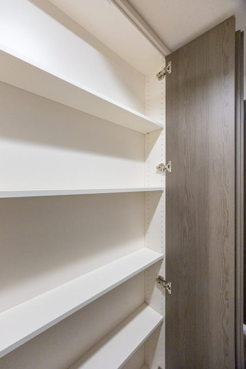 玄関入って左側にはシューズインクローゼットが造られています。中には可動棚が設置されているので、持っている靴に合わせて調節が可能。ベビーカーなども置いておけそうですよ。また、廊下には収納棚を完備。