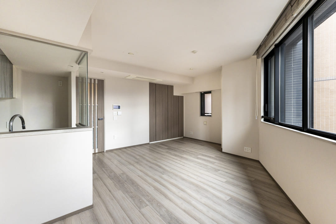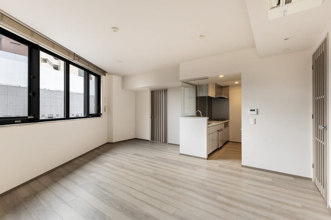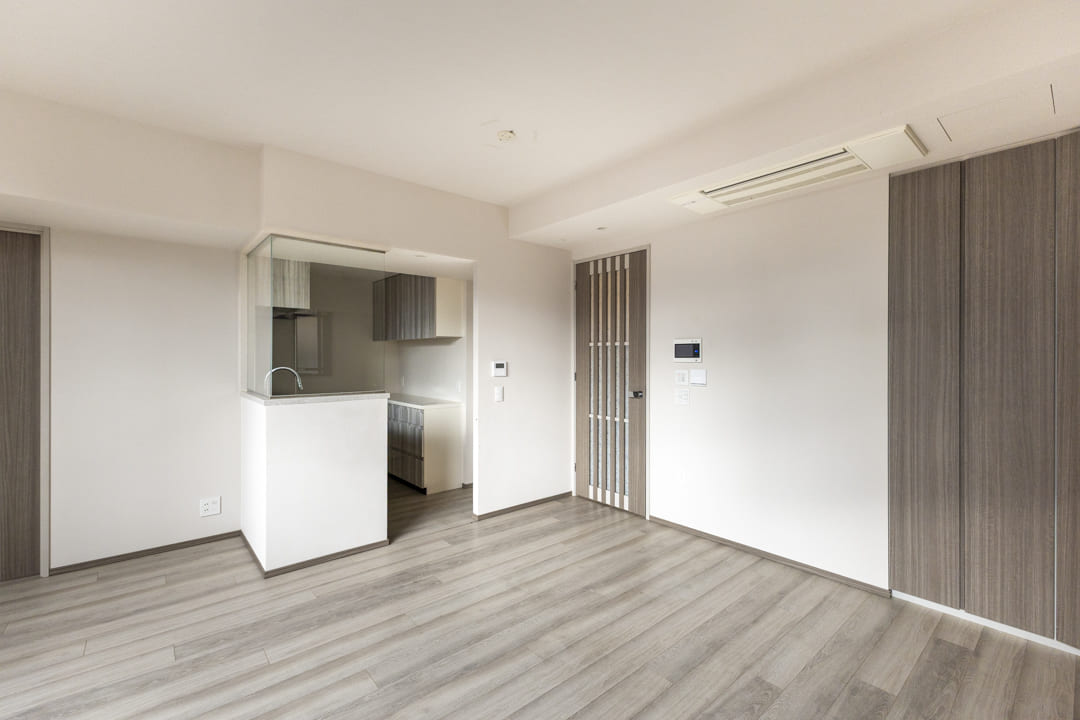 窓が多く、光と風が心地よく行き交うリビングダイニング。ビルトインエアコンを採用することで、生活感を抑えながら、室内全体を快適に保ちます。木目の美しさが際立つフローリングと建具を配した内装は、ナチュラルで飽きのこない印象。主張を抑えた色調のため、さまざまなテイストの家具と調和しやすく、現在お持ちのインテリアも自然になじみます。