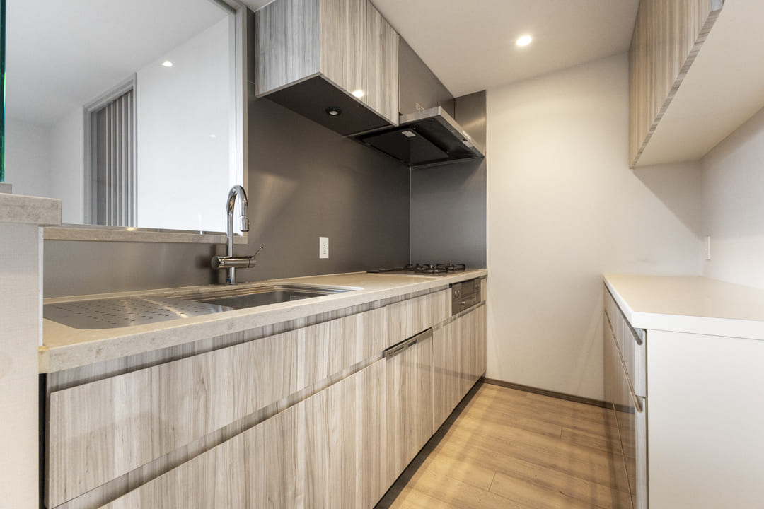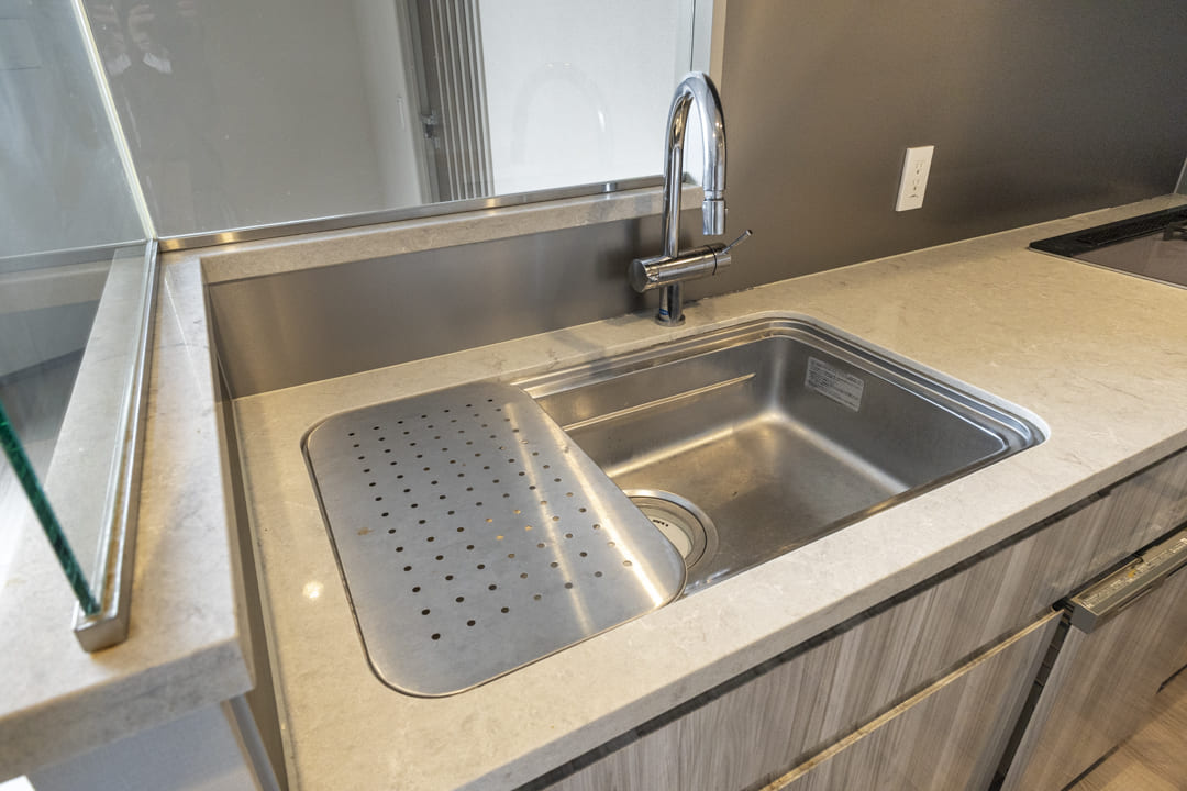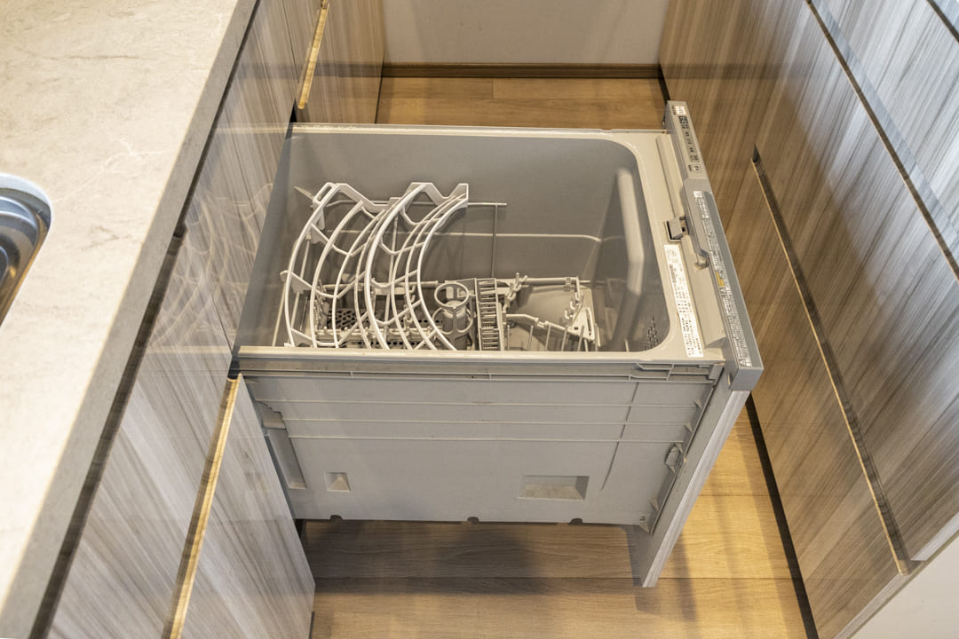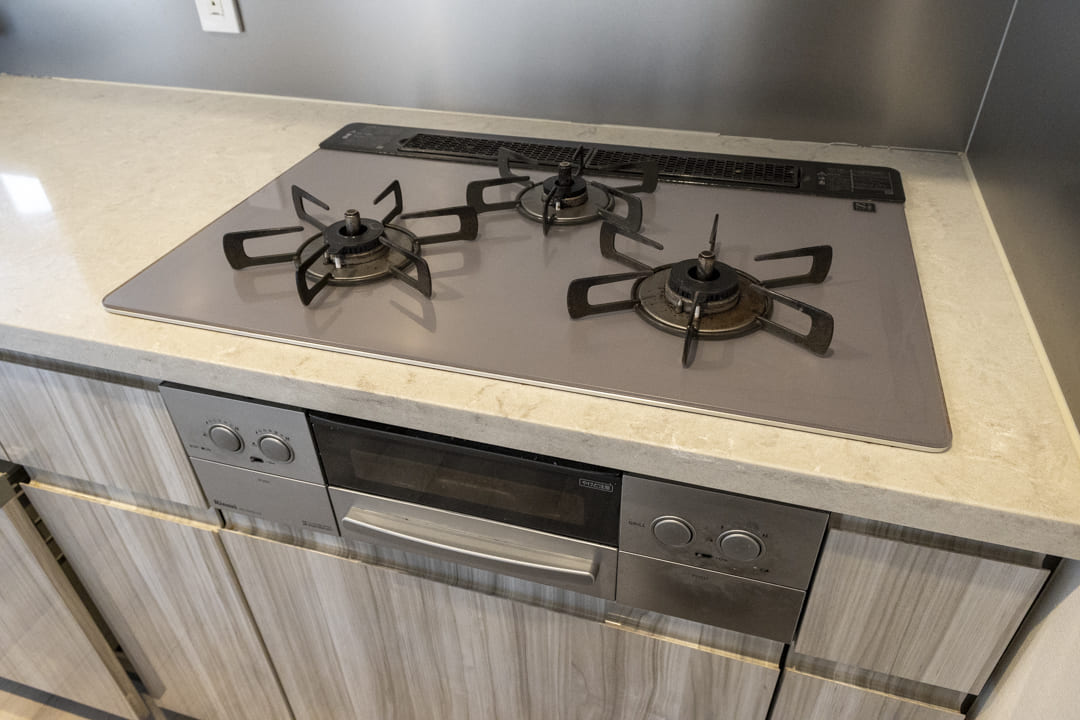 独立性の高いキッチンは作業に集中しやすく、調理中のにおいが生活空間に広がりにくいのも魅力です。グリル付3口ガスコンロや食洗機を備え、設備面も充実。ディスポーザーも付いているので料理後すぐに生ゴミを処理でき、清潔な状態を保つことができます。