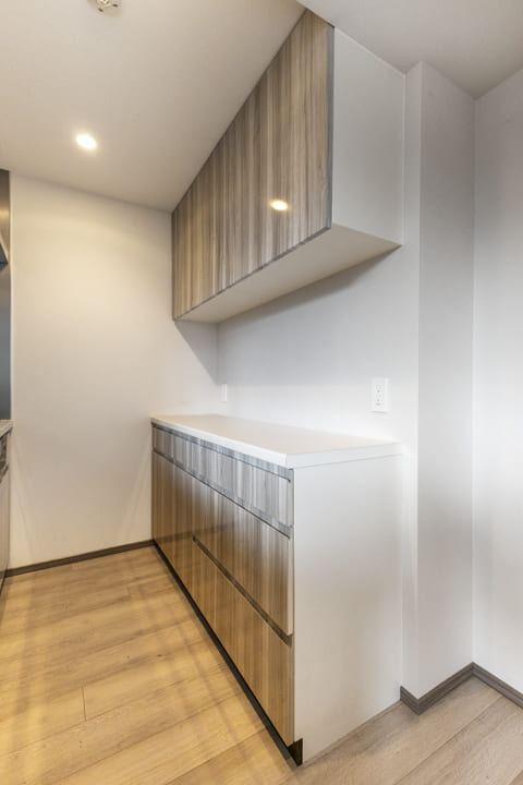 背面にはキッチンと同じデザインのカップボードを完備しています。食料品のストックや食器類を整理整頓でき、散らかりがちなキッチンまわりがすっきり片付きそう。カウンターにはコンセントが付いていて、炊飯器やコーヒーメーカーといったキッチン家電の使用に便利です。