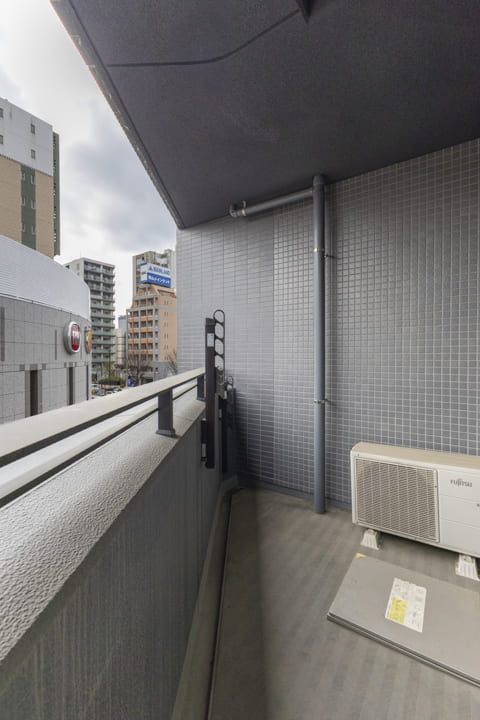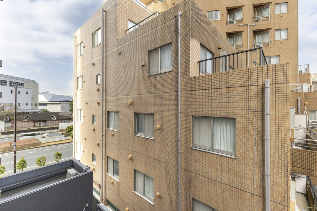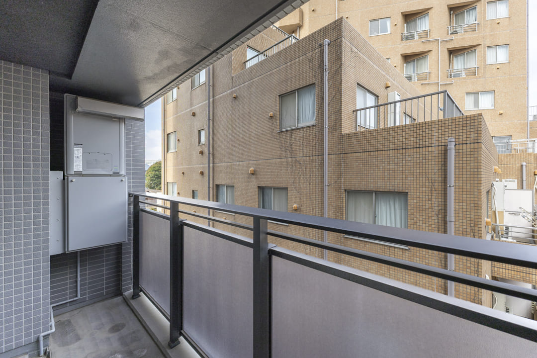 洋室に面するバルコニー。6.09㎡です。周辺は低層住宅が多く、落ち着いた眺めです。撮影日はあいにくのお天気でしたが、南東向きのため、晴れの日には心地よい自然光が届きそうです。