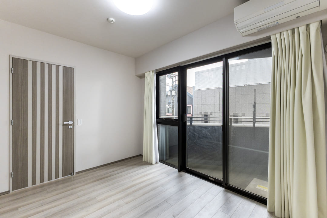 バルコニー付きで広々とした洋室。対面側には壁いっぱいにクローゼットが並び、収納性に優れています。ハンガーパイプ&棚板の高さを調節でき、隅々までたっぷり収納できますよ。荷物を整理整頓し、居室空間を有効活用できそうですね。