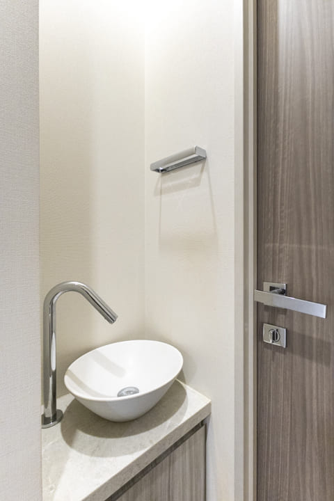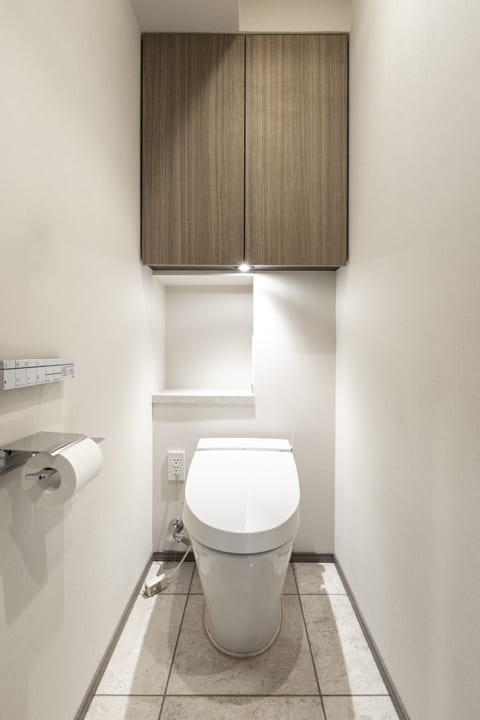 廊下に面していて独立性の高いレストルーム。LIXIL製の洗浄機能付トイレを採用しています。手洗いカウンター付きなのですぐに手を洗うことができて衛生的。収納力のある吊戸棚には、トイレットペーパーや掃除用品をすっきり収納できます。さらに、カウンターには小物やお花を置くことができ、インテリアの楽しみが広がりそうです。
