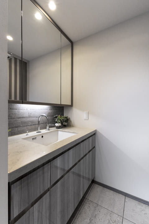 石調デザインで高級感の漂う洗面化粧台。三面鏡下に照明が設置されていて、手元を明るく照らしてくれます。カウンタースペースにゆとりがあり、化粧品やドライヤーの仮置きができるのも嬉しいポイント。洗面台本体の収納に加え、リネン庫も完備していて、いつも清潔な洗面室をキープできそうです。