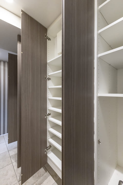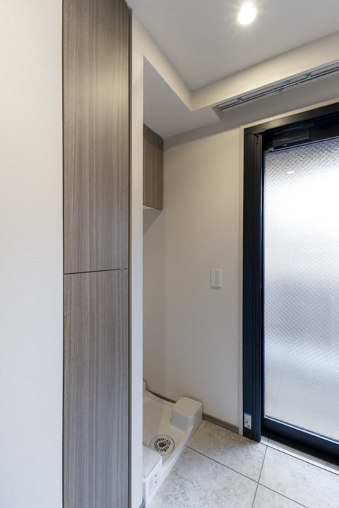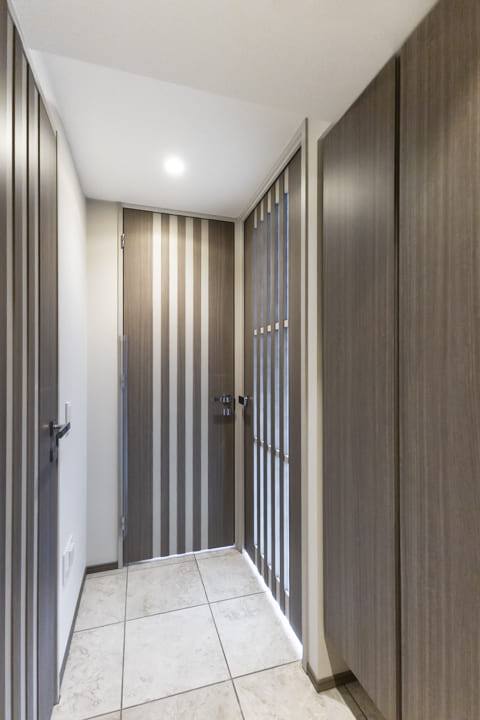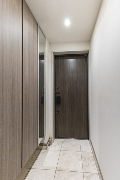 人感センサー搭載でいつも明るく出迎えてくれる玄関。荷物で両手が塞がっている時や夜遅く帰宅した時に、スイッチを探す手間がかからず助かります。大容量のシューズボックスと廊下収納を備え、すっきりとした空間に。扉の一部が鏡張りになっていて、靴を履いた状態でコーディネートチェックできるのもポイントです。