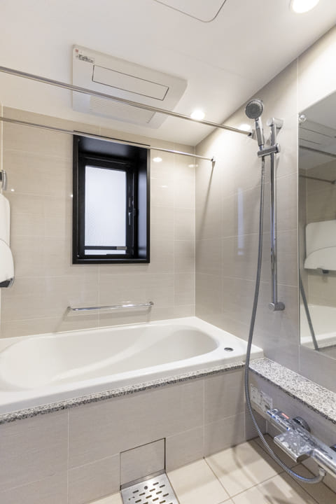 窓付きで自然光が入るバスルーム。しっかり換気できるのも嬉しいポイントです。換気・暖房・乾燥・涼風機能付きで1年中快適なバスタイムに。雨の日の洗濯スペースとしても重宝しそうです。追い焚き機能も搭載されているので、ゆっくり半身浴をお楽しみいただけます。