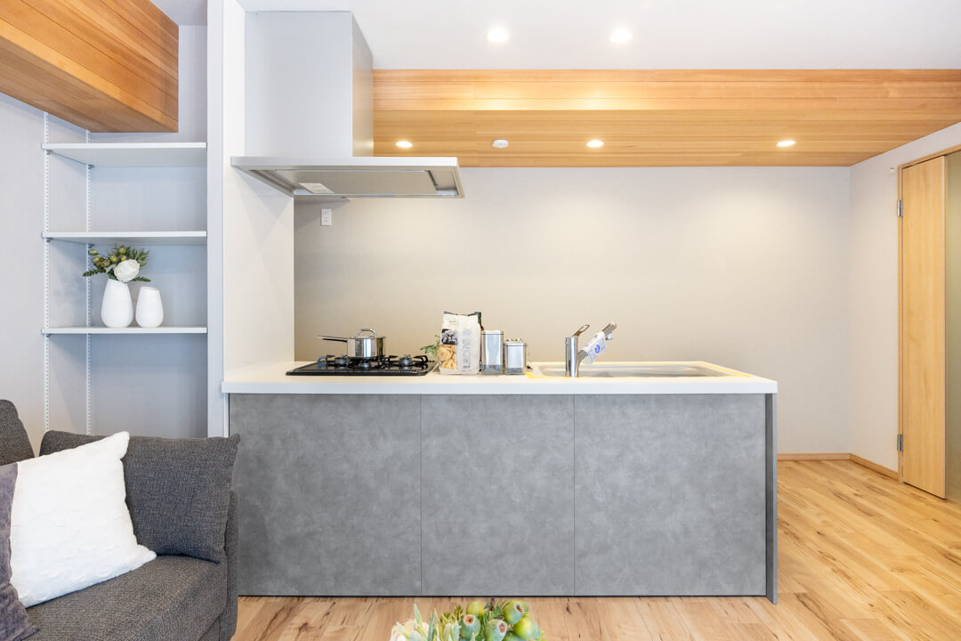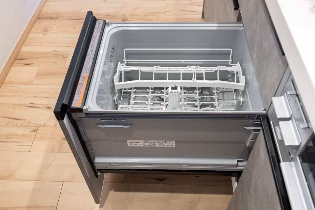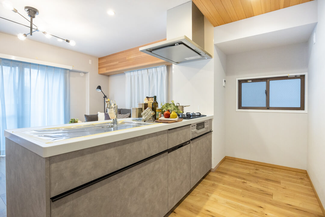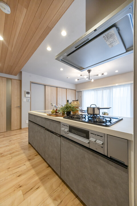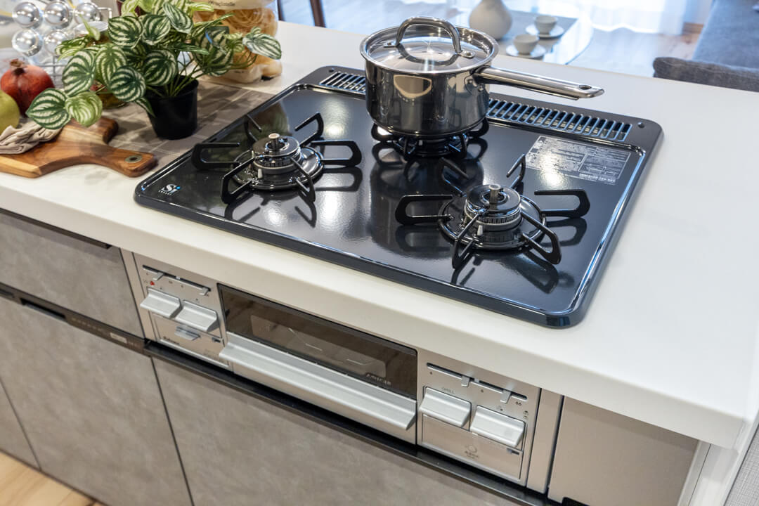 リビングダイニングが見渡せる開放的なオープンキッチン。家族やゲストと会話がしやすく、小さなお子さんがいるご家庭では子どもの姿も見守れます。料理が捗る3口ガスコンロ、家事の時短に心強い食洗機付き。小窓も付いていて換気もよりスムーズに行えます。