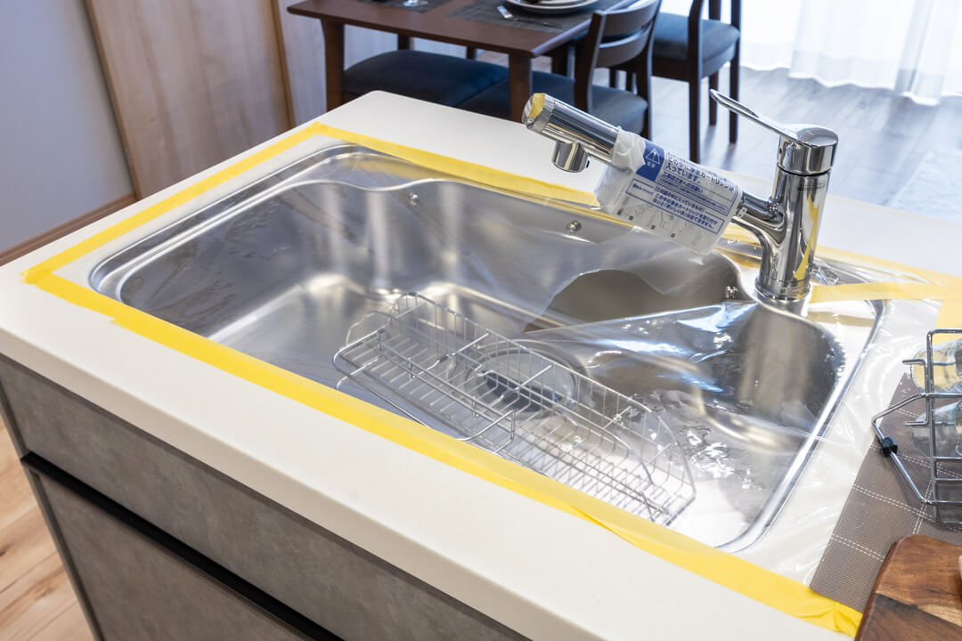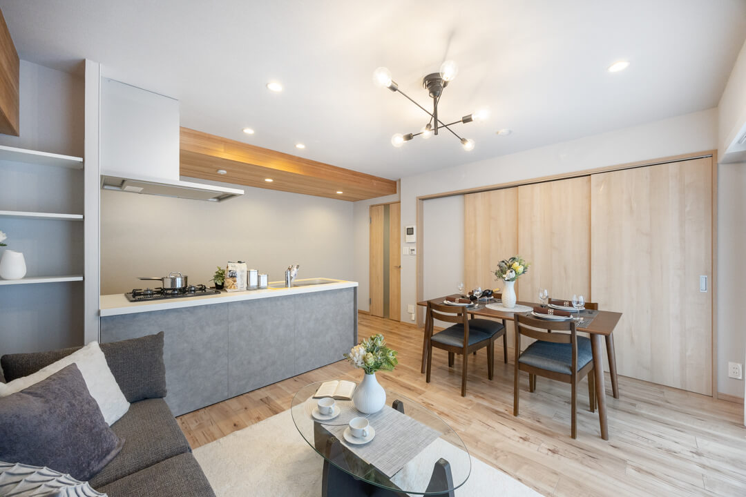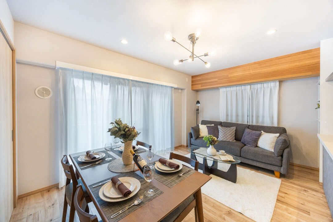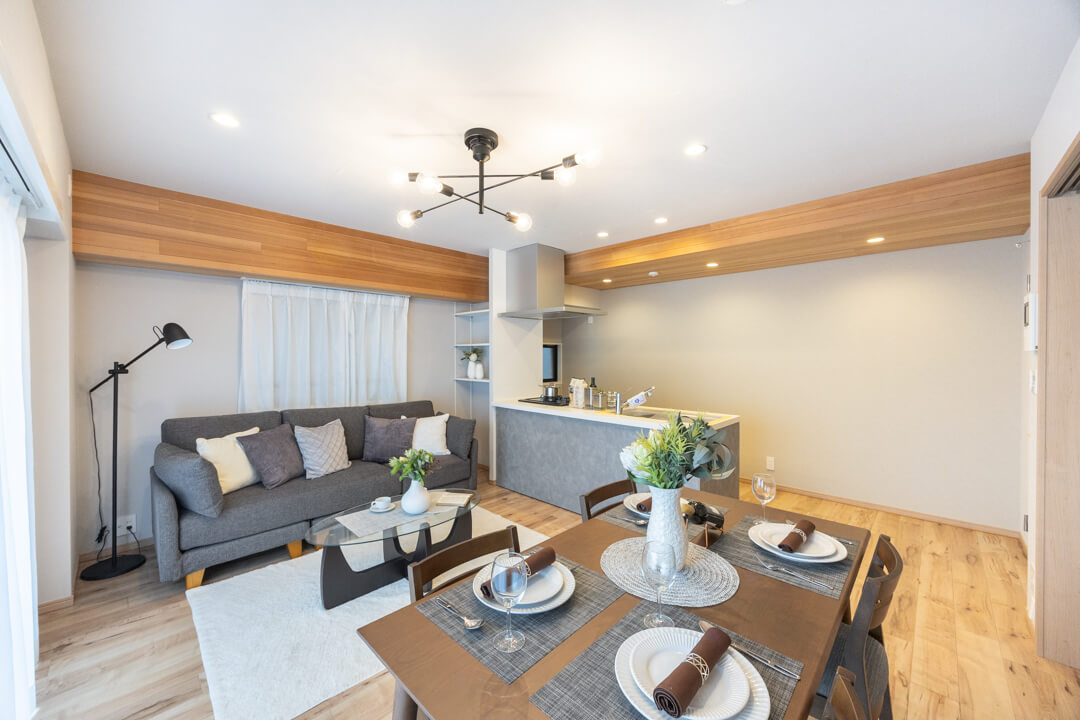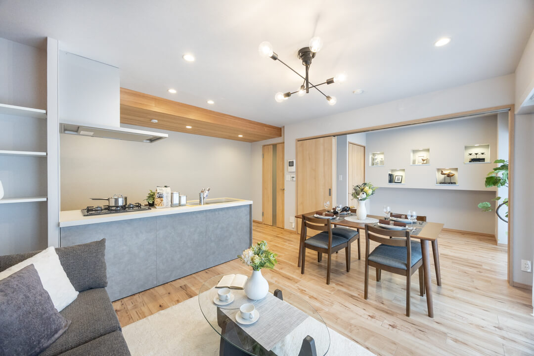 リビングダイニングが見渡せる開放的なオープンキッチン。家族やゲストと会話がしやすく、小さなお子さんがいるご家庭では子どもの姿も見守れます。料理が捗る3口ガスコンロ、家事の時短に心強い食洗機付き。小窓も付いていて換気もよりスムーズに行えます。