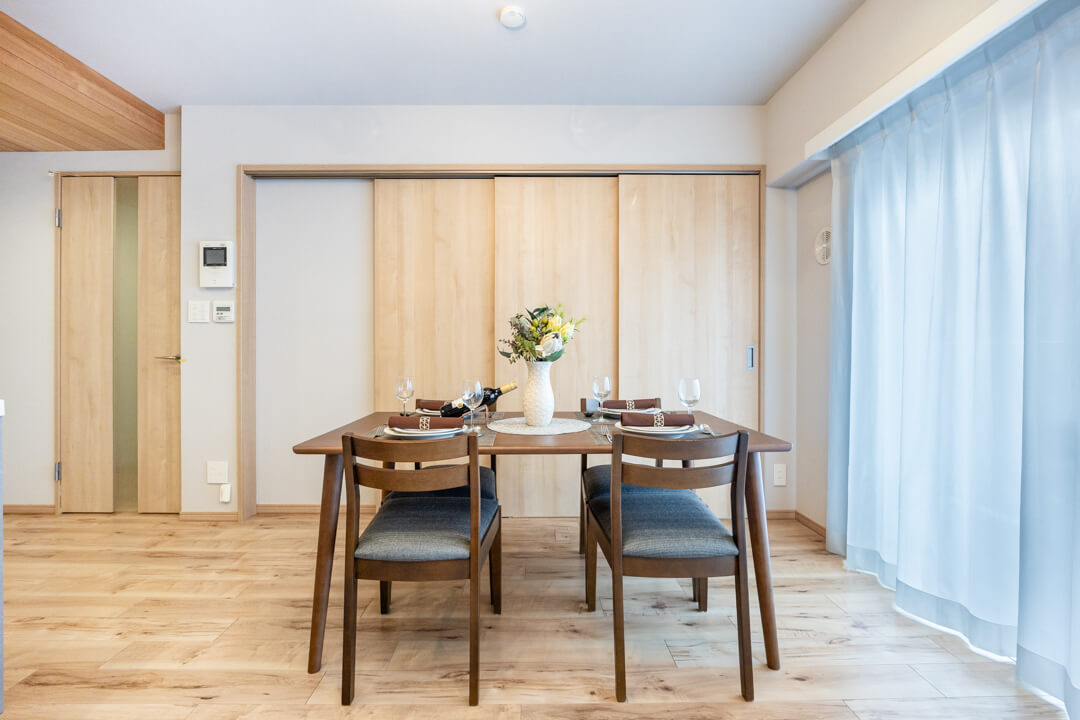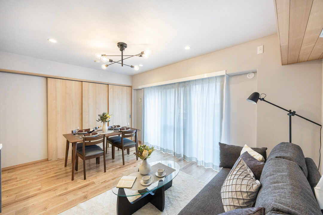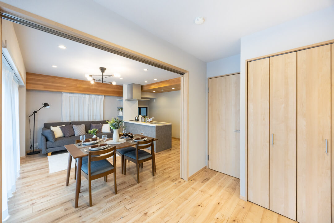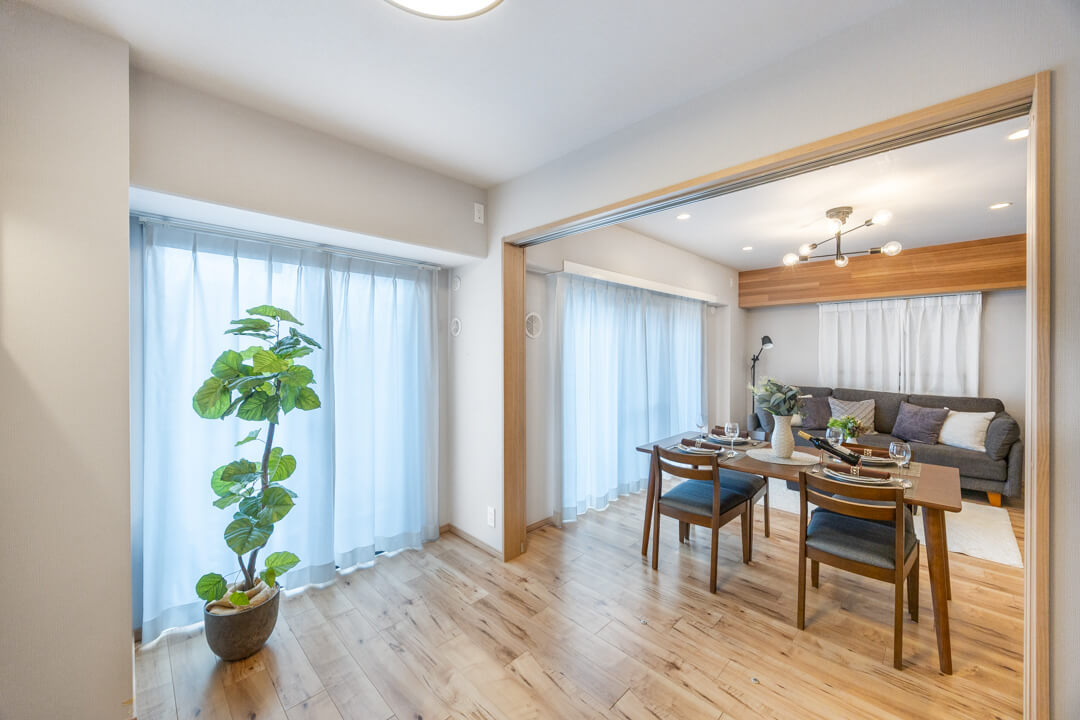 リビングと隣接している洋室と繋げてより広々過ごせます。床にドアレールがないので見た目もすっきりとした印象。レールにホコリがたまる心配もないので衛生的にも◎です。