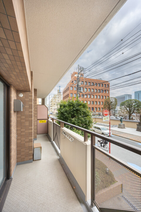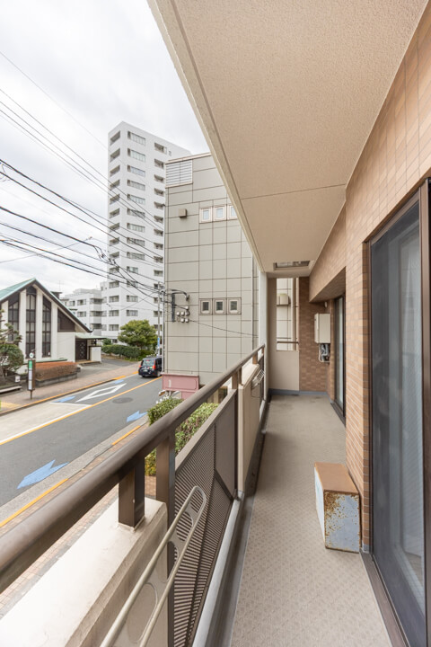 リビングダイニングと洋室(約5.1帖)に面したバルコニー。約7.75㎡ほどの広さです。南東向きで陽当りも良好。バルコニー目の前の建物とは距離が保たれているので、見晴らしの良い景色になっています。