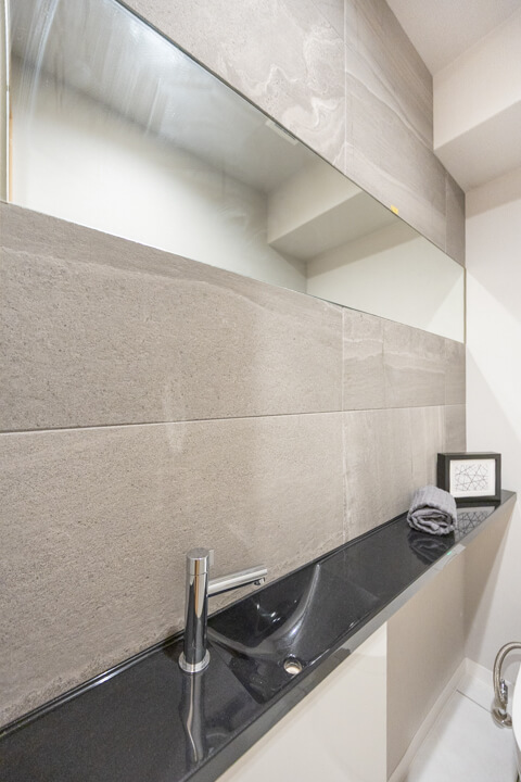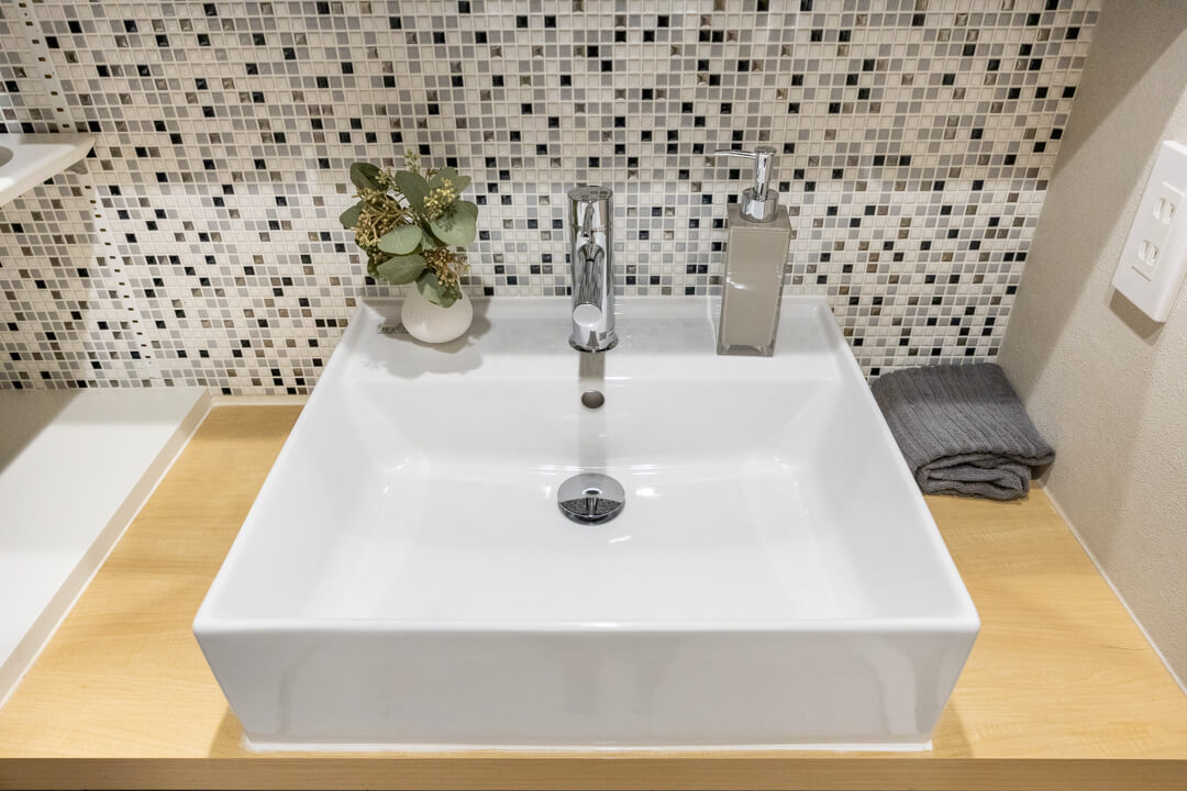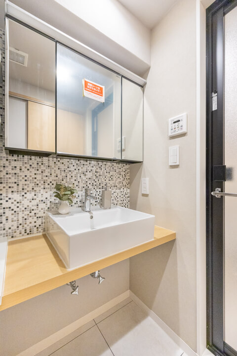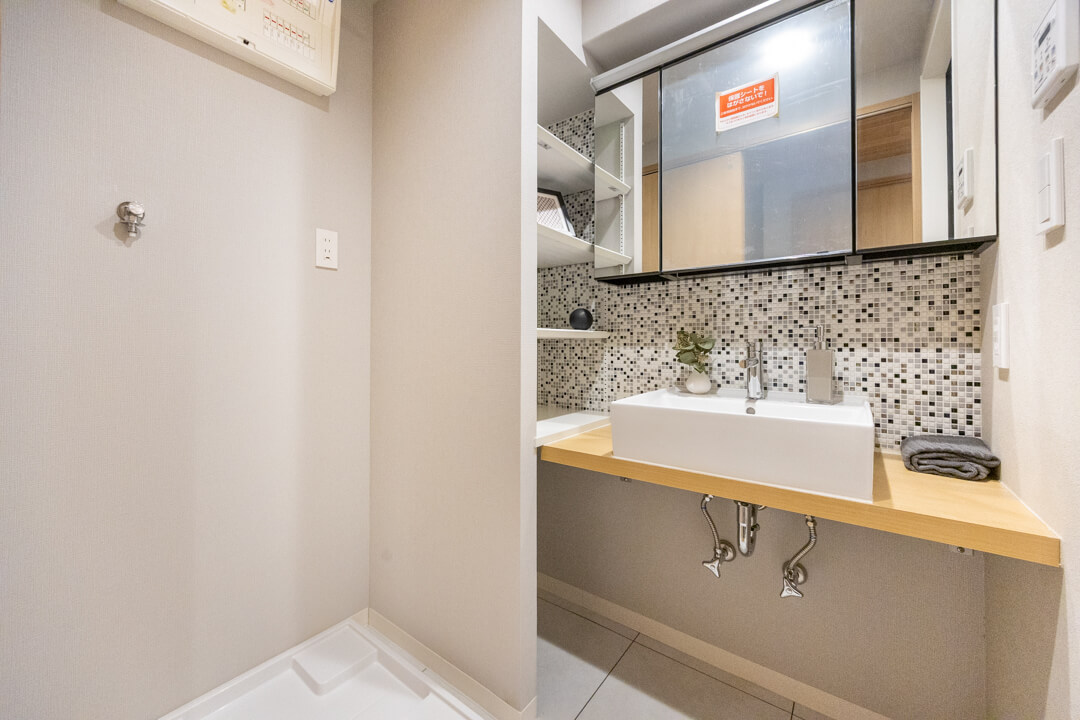 モザイクタイル使いが可愛らしい洗面化粧台。洗面まわりの小物がすっきり整頓できるミラーボックス付きでいつでも整った状態をキープできそう。洗面横にも可動棚が設置されています。